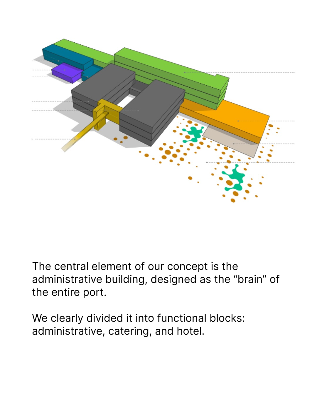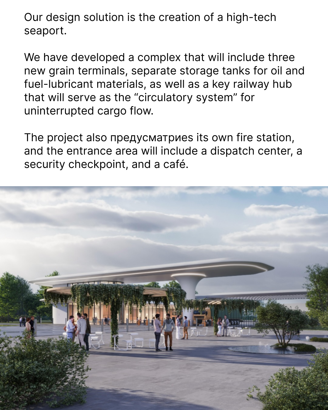 The heart of the port is a multifunctional administrative building. It serves as the main management center for the complex, combining an administrative wing, a hotel, a dining hall, and a full-scale fitness and wellness center with a swimming pool and a gym. We have also included a pedestrian bridge connecting to the terminals.
