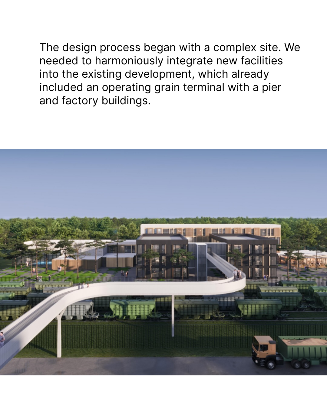 The design work was carried out on a complex site with existing infrastructure. Our solution was to create a high-tech port that includes three grain terminals, storage tanks for oil and fuel, and a key railway junction.