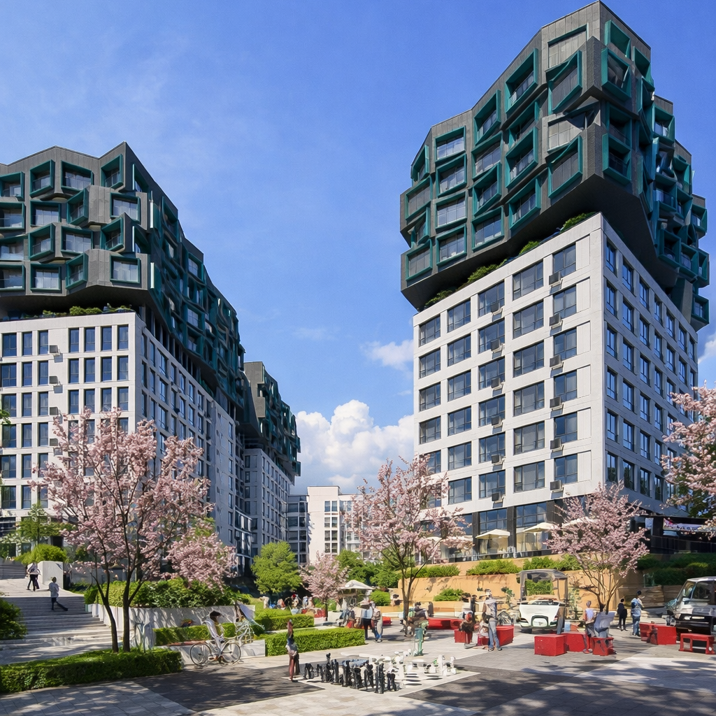 Today, Osokorky suffers from haphazard high-rise development lacking proper infrastructure. Traffic jams, a shortage of schools, kindergartens, and parking spaces, and a lack of green spaces are the main problems in this area. We have tried to take these factors into account and create a residential complex that will stand out significantly from its neighbors.