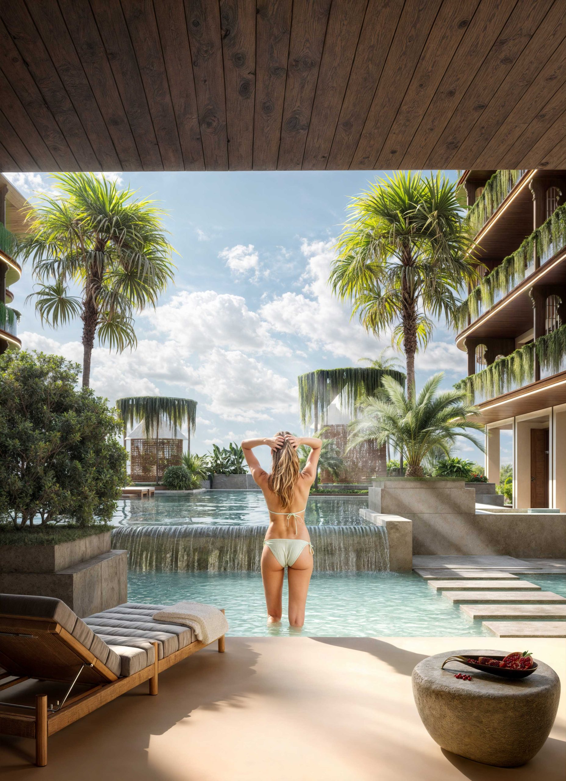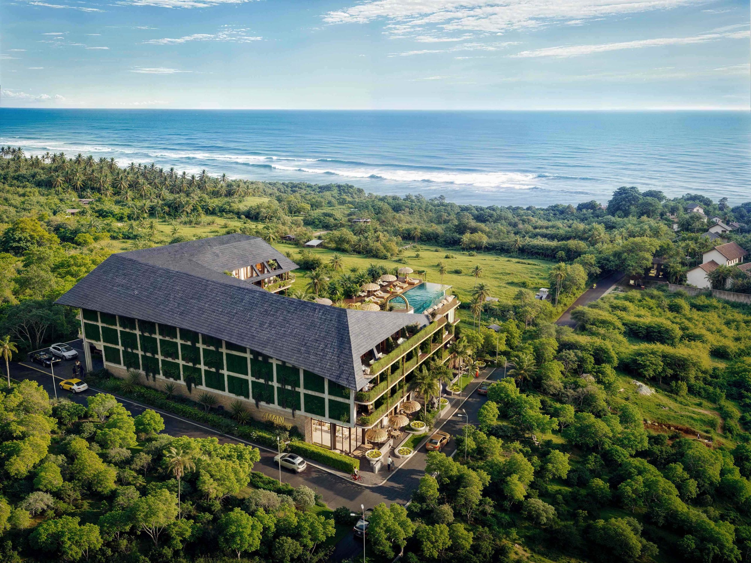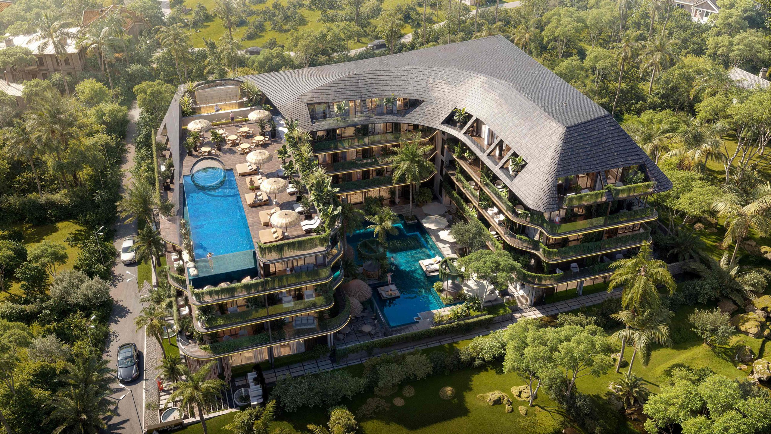 The complex derives a distinct expressiveness from its sculptural roofing, which transforms into a rooftop terrace featuring a panoramic bar and an infinity pool, revealing breathtaking views of the ocean expanse and verdant slopes. The landscape design is inspired by the Indonesian philosophy of harmony and the aspiration toward the sky and sun.