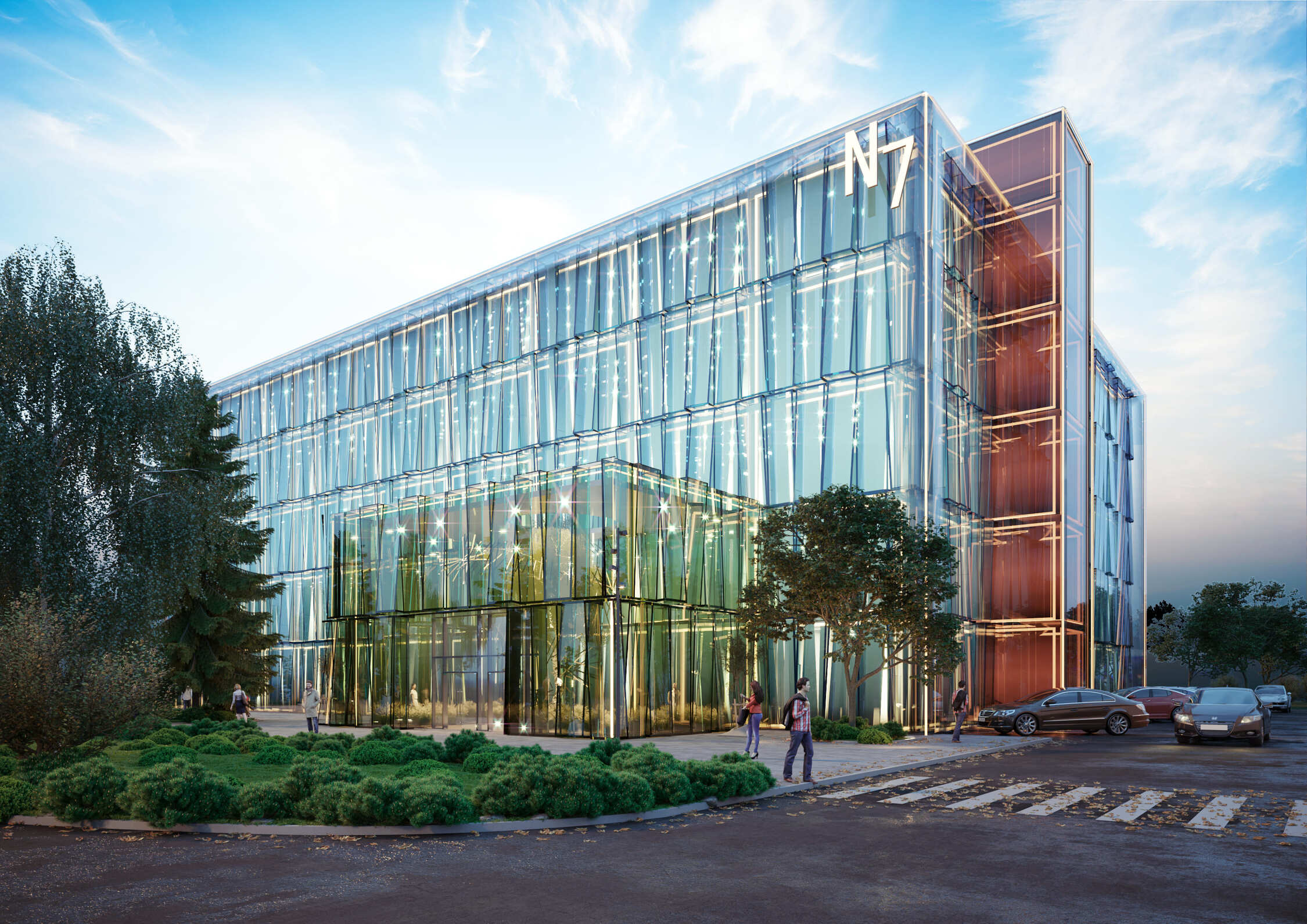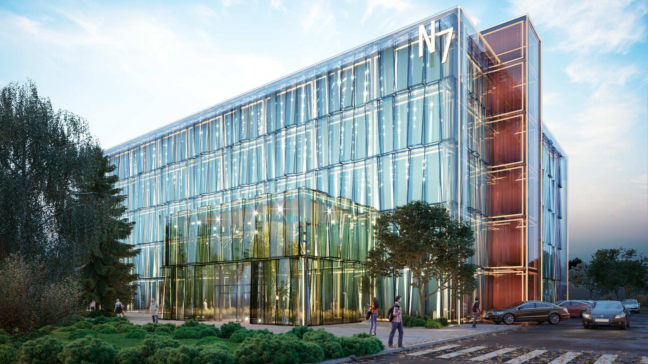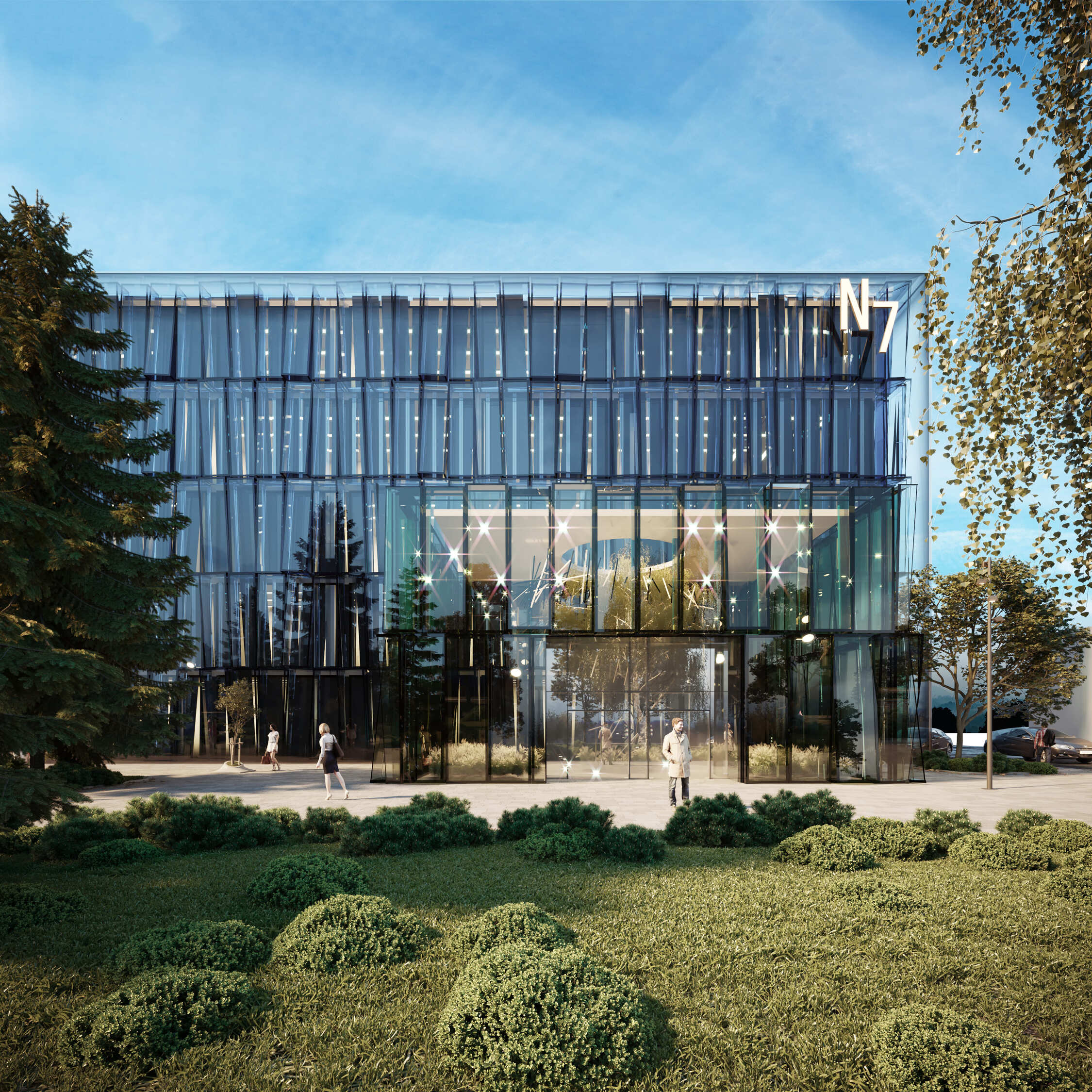 Business Center N7 is a reconstruction project transforming a light industry building into a modern office facility. The design involves preserving the load-bearing structures of the first two floors while constructing new levels using lightweight metal structures.