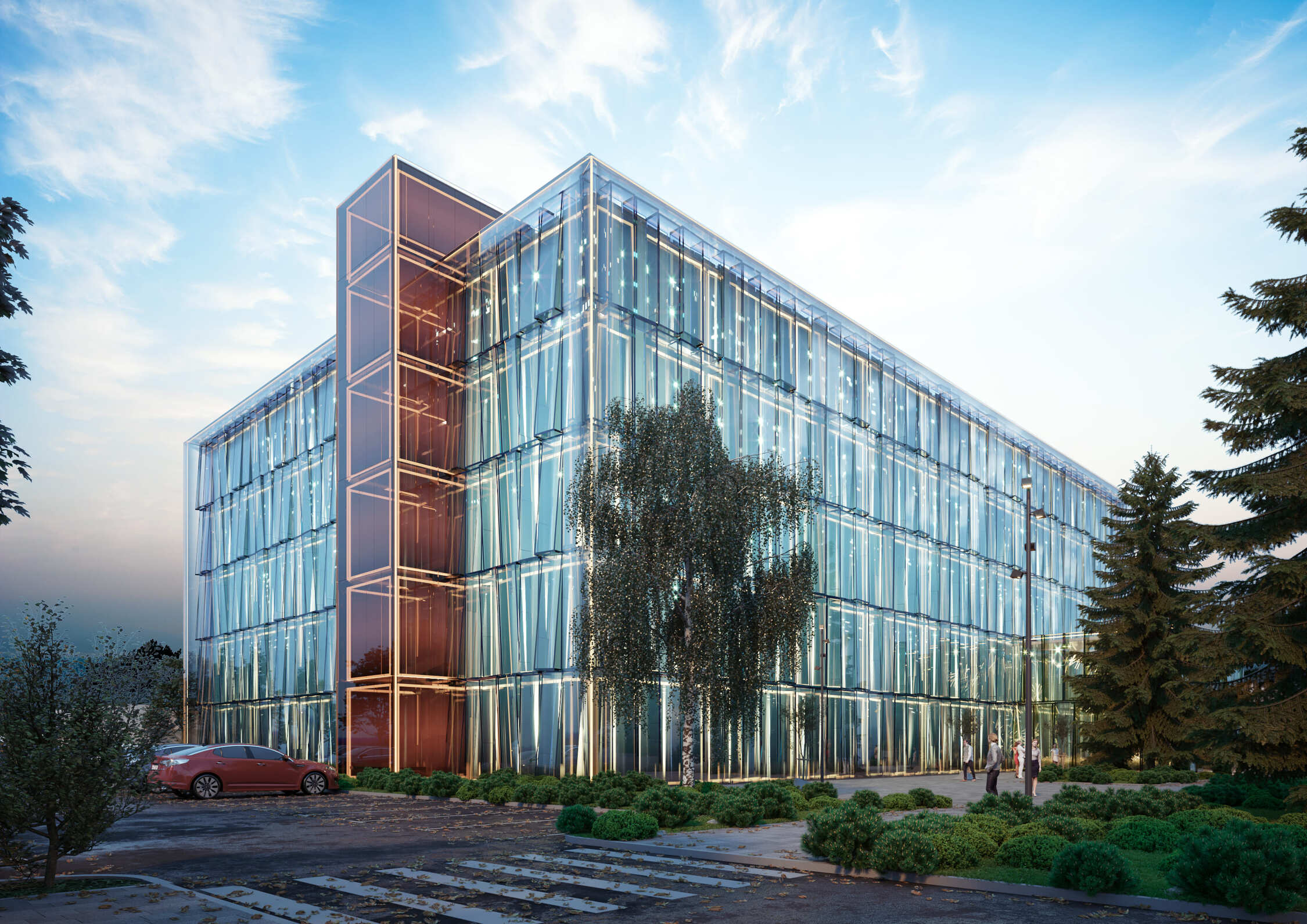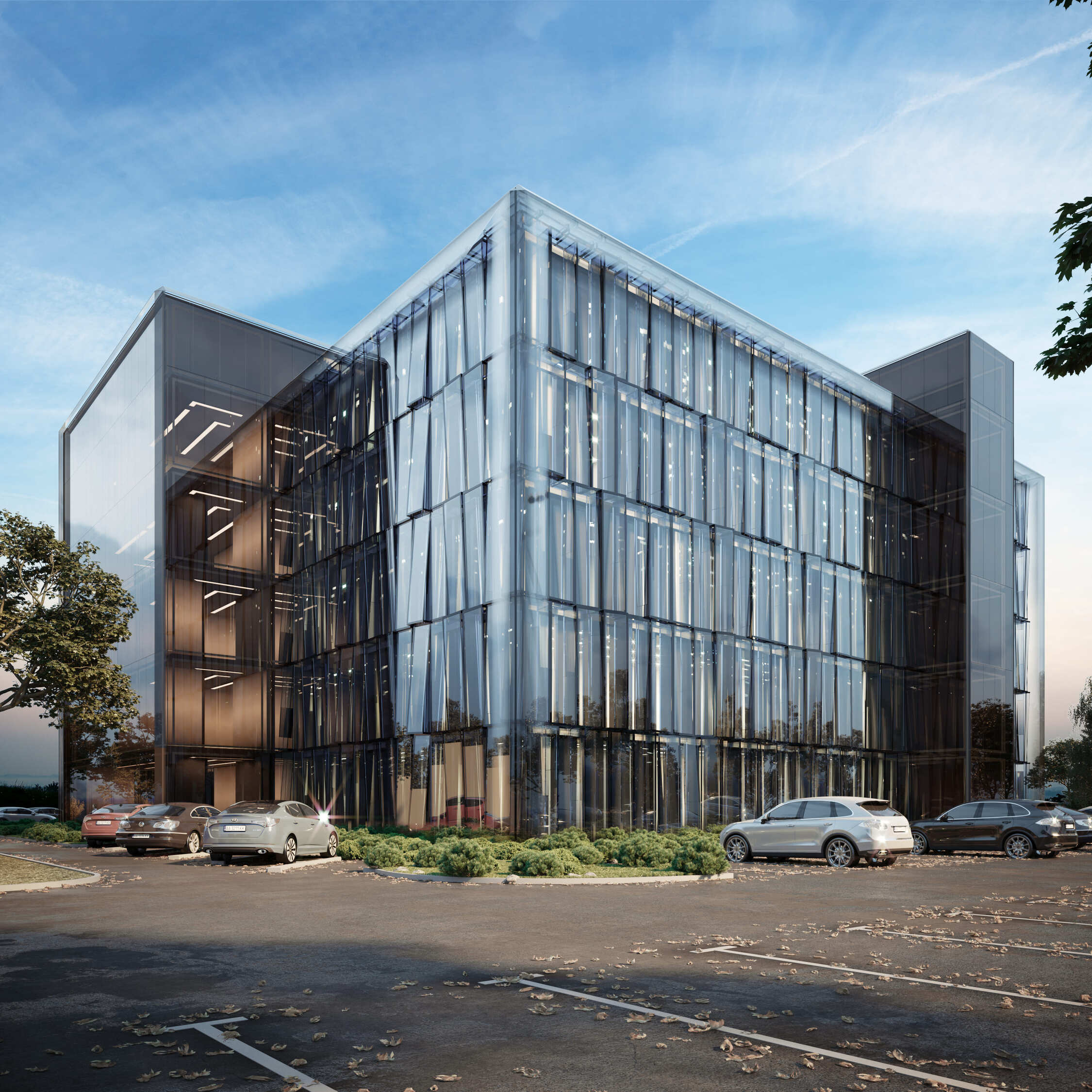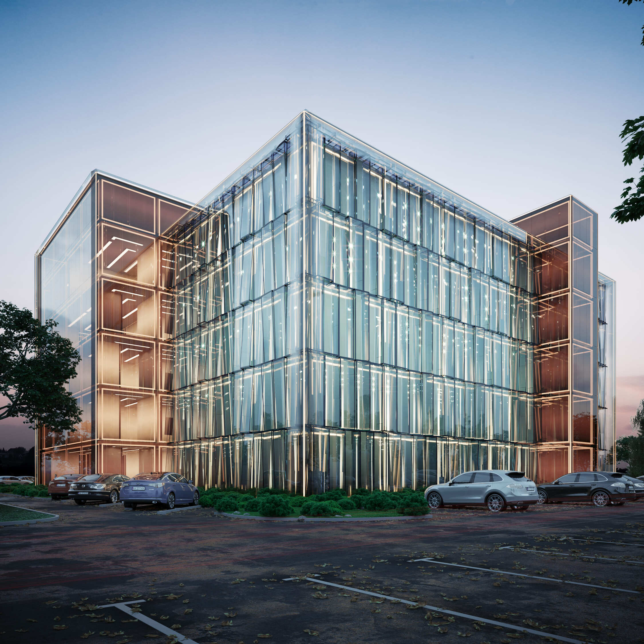 The architectural identity is defined by a distinct glass façade made of glued glass units in various shades, creating depth and rhythm. The centerpiece of the entrance group is a full-height atrium. The contrast between the laconic interior of the lobby and the dynamic exterior highlights the building’s modern character. Rhythmic lighting throughout the atrium reveals changing geometric perspectives depending on the viewing angle.