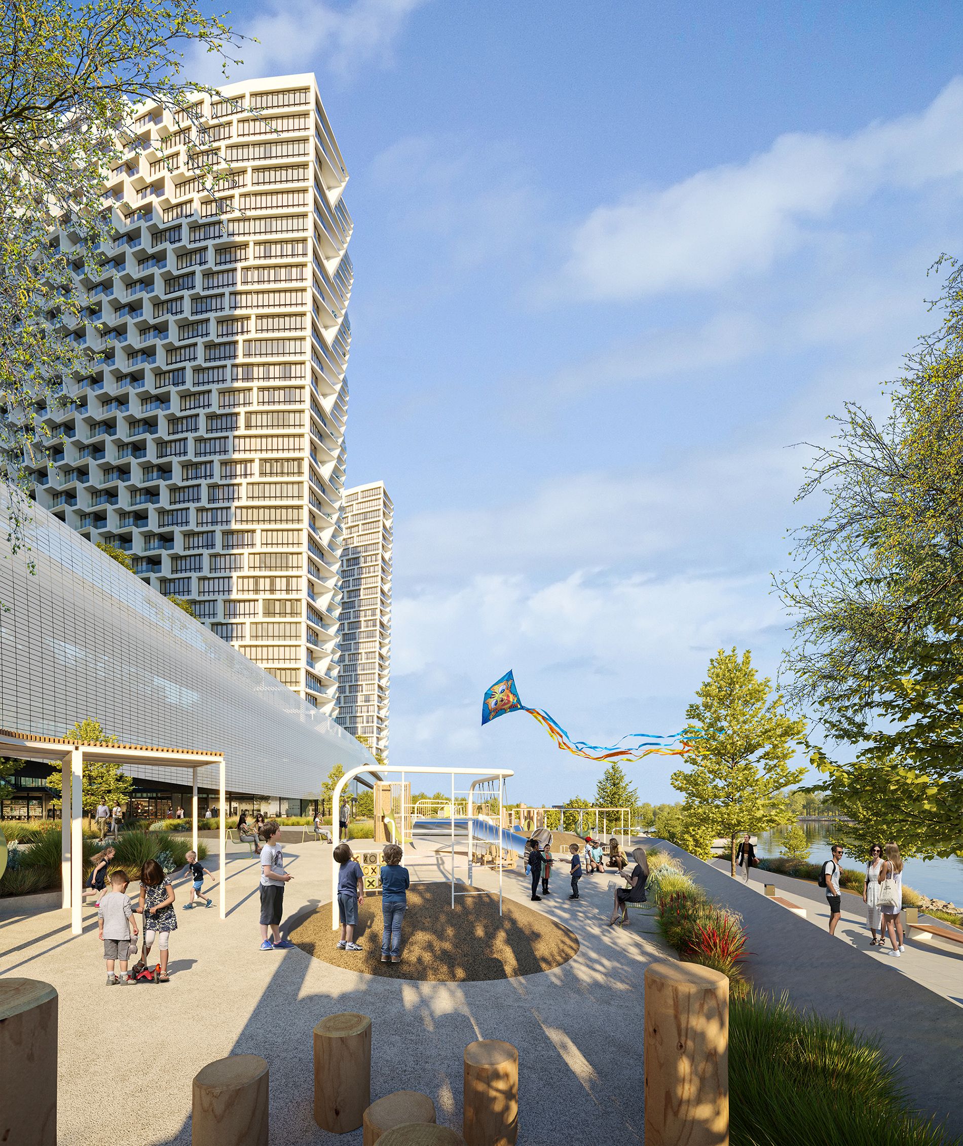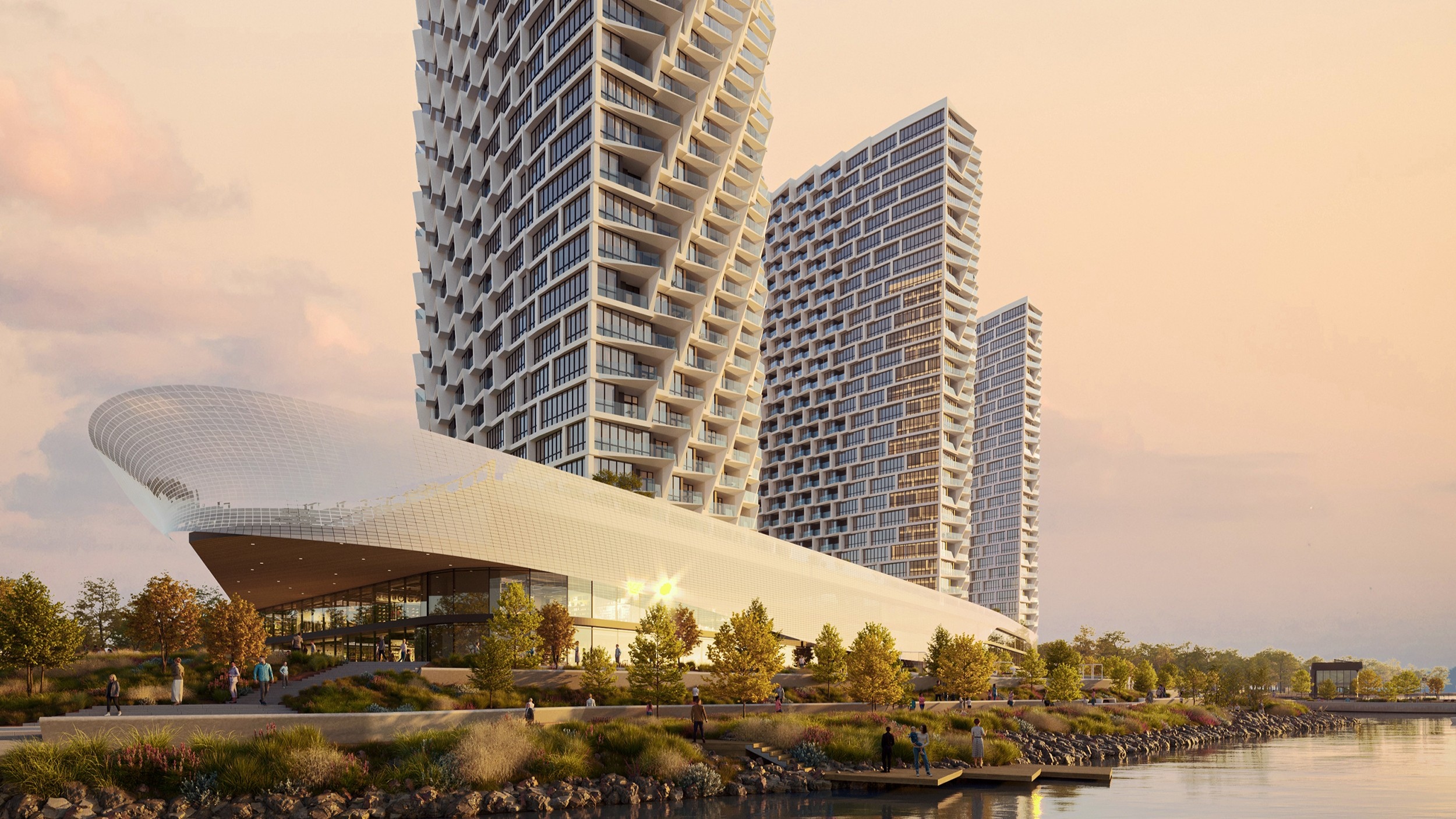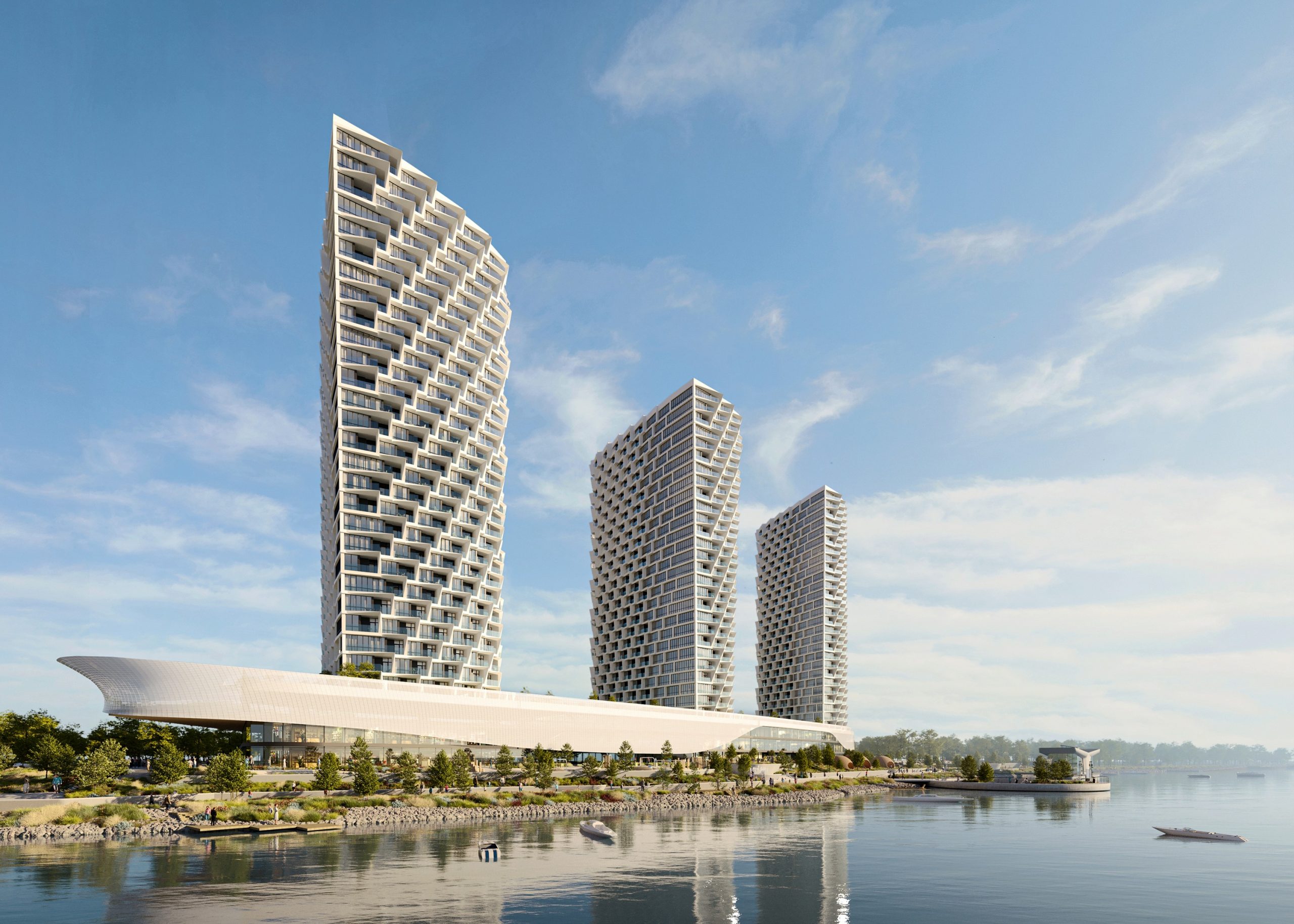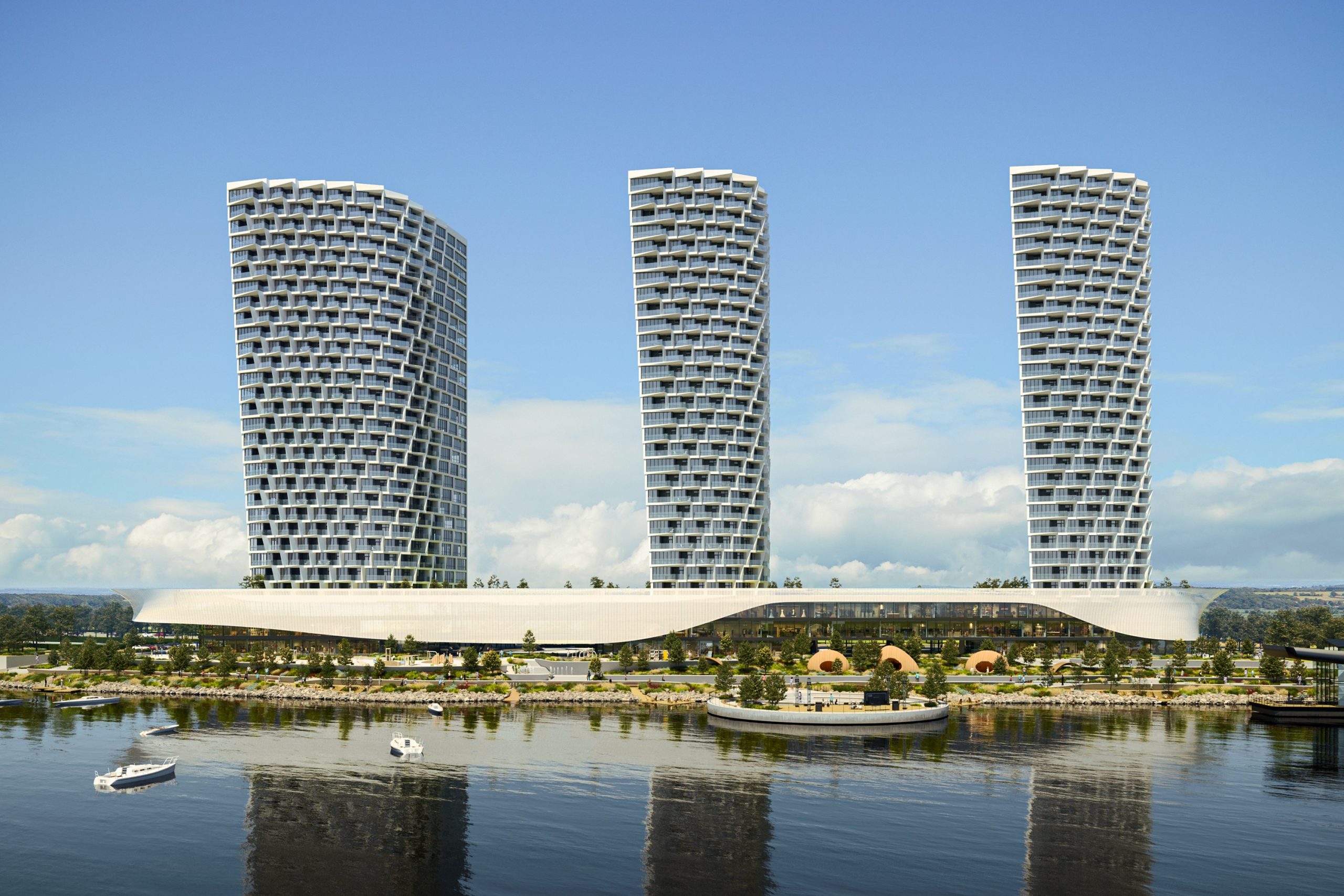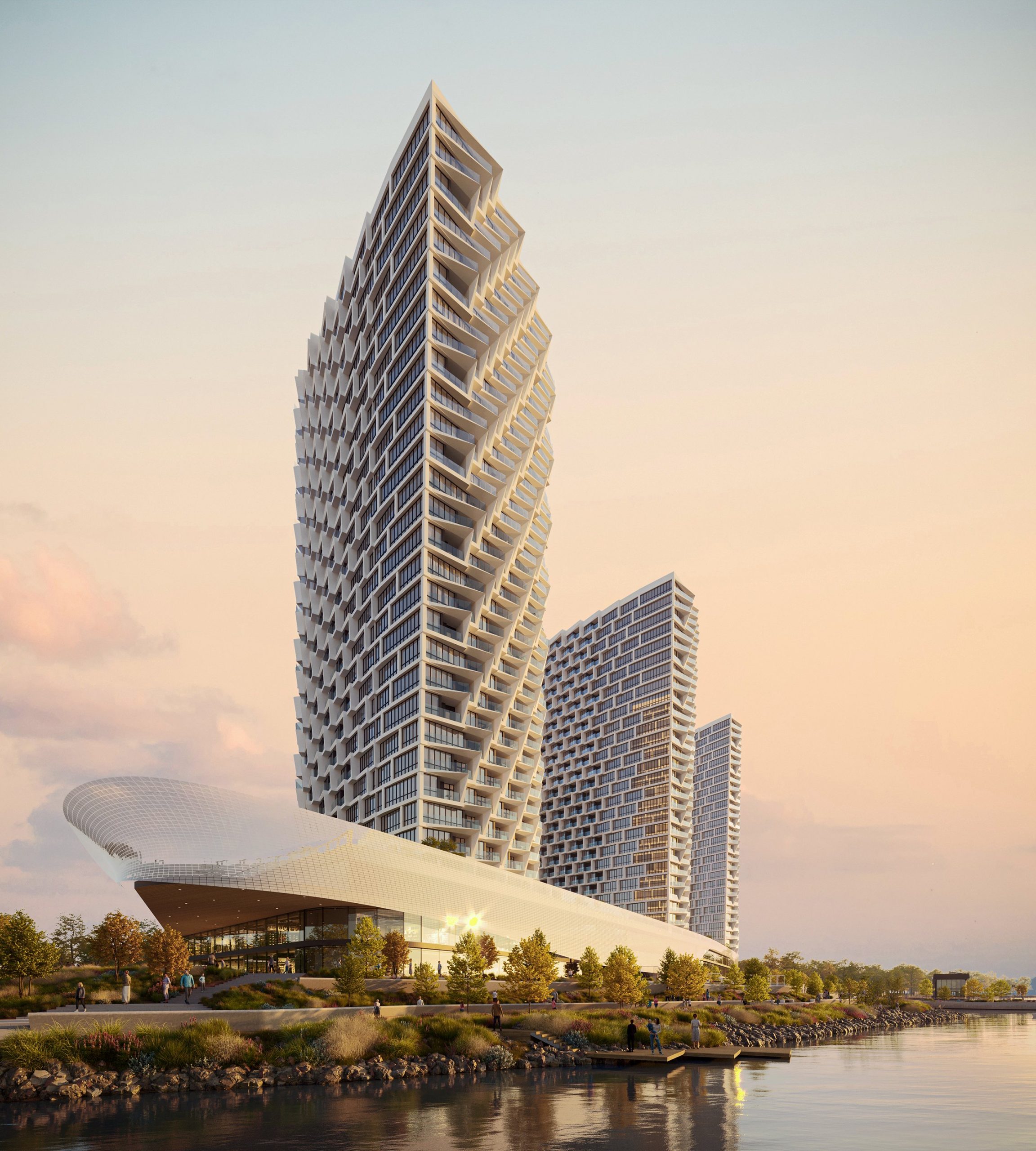 This 90 000 m² building includes 780 apartments, commercial space, offices and a variety of public amenities. These towers feature a notable curved corner, wrapped by terraces that continue around the buildings`s perimeter with views of the river and city. Individual terraces are stacked 27 floors high and rotated to provide the best insolation and possible views for the apartments.