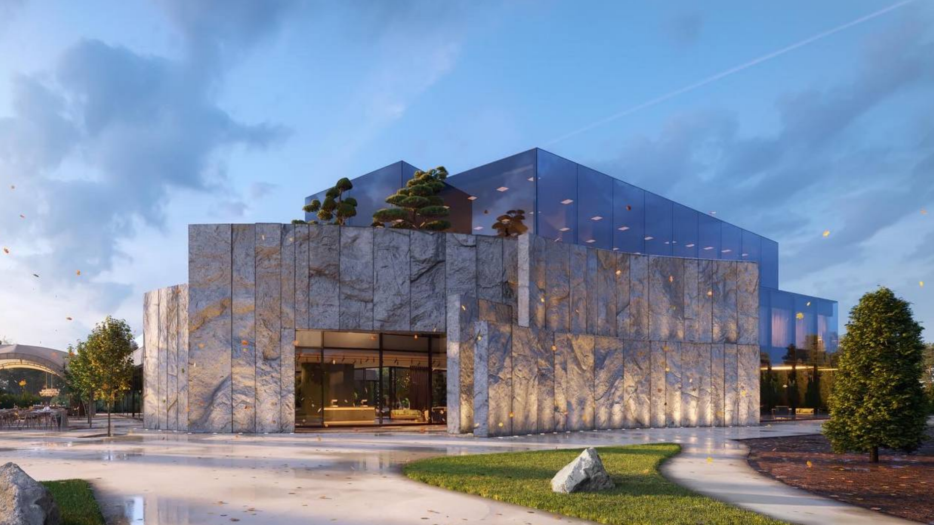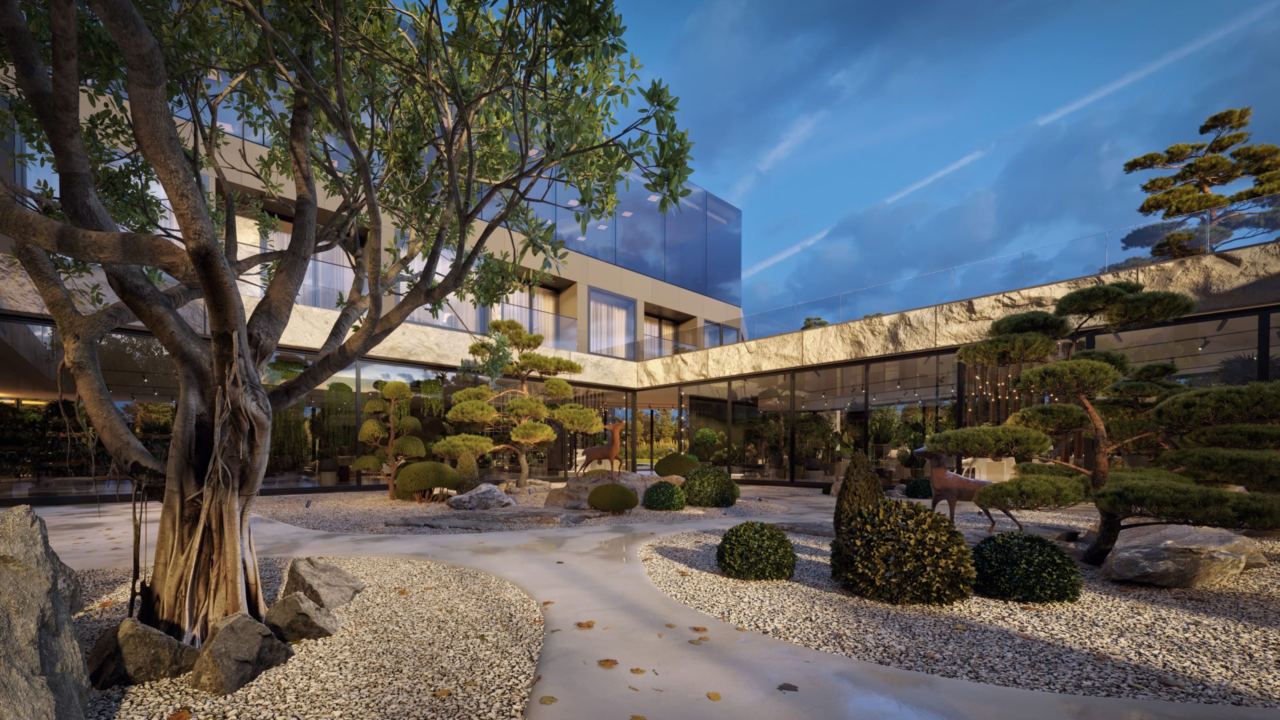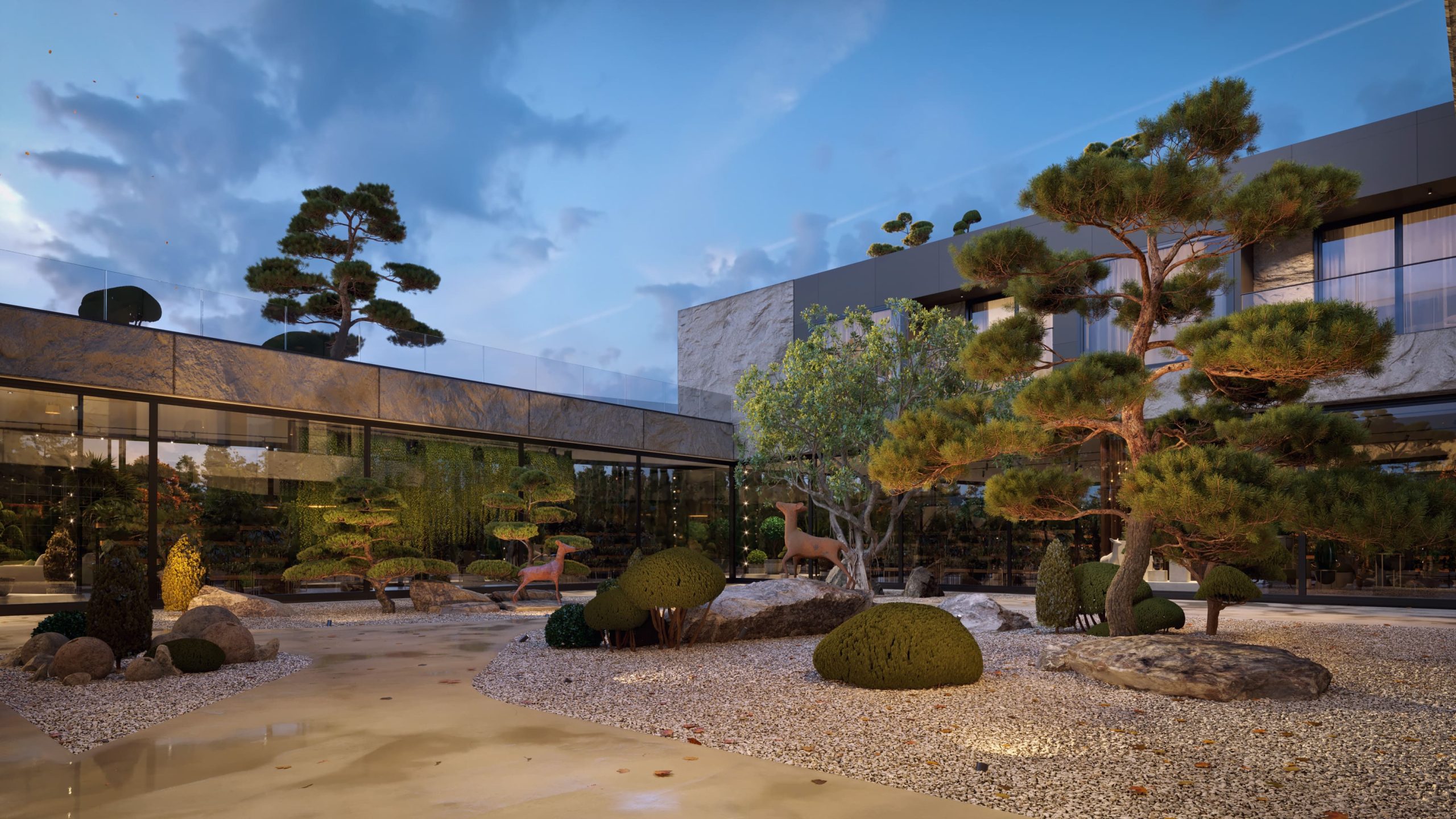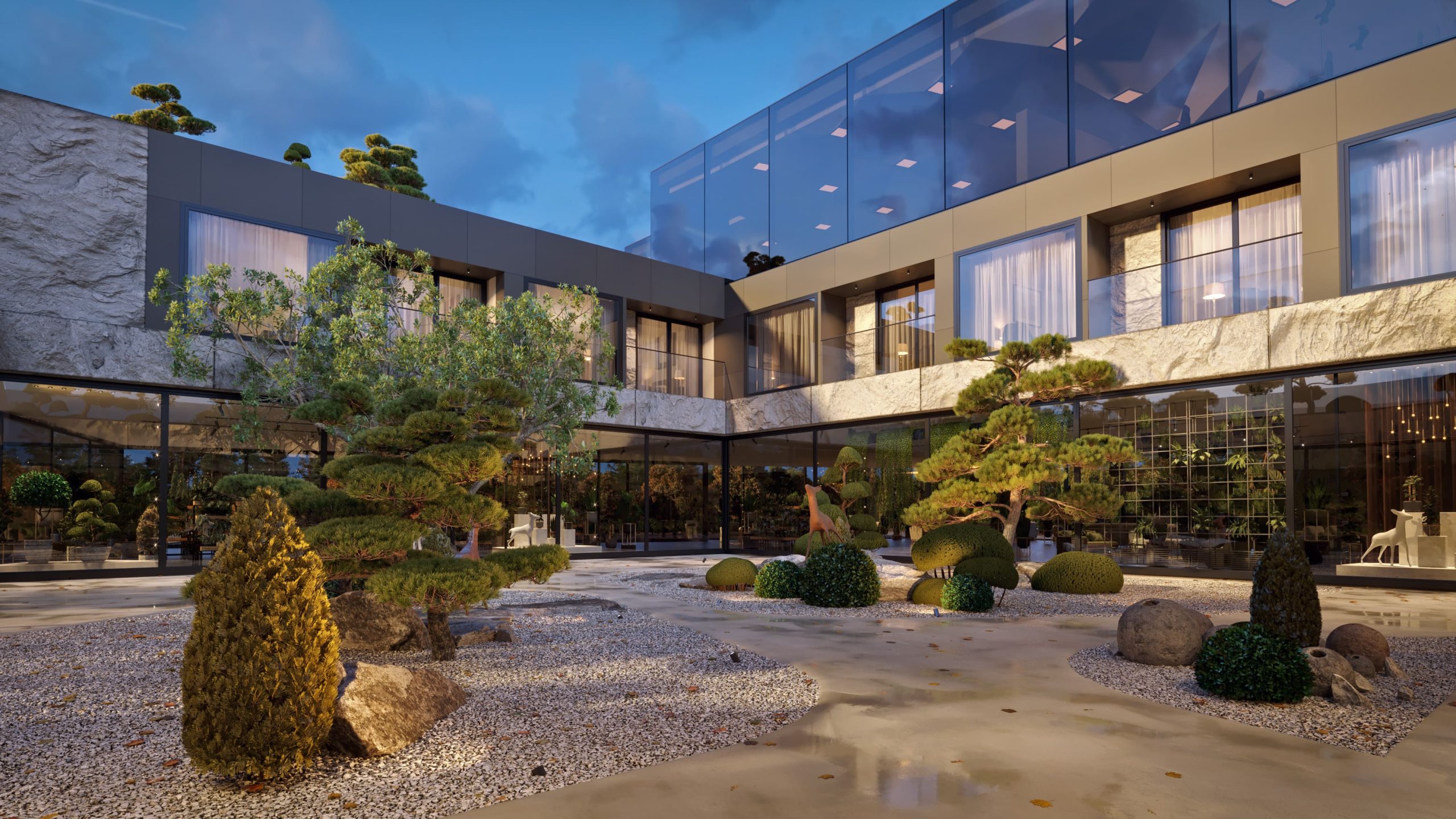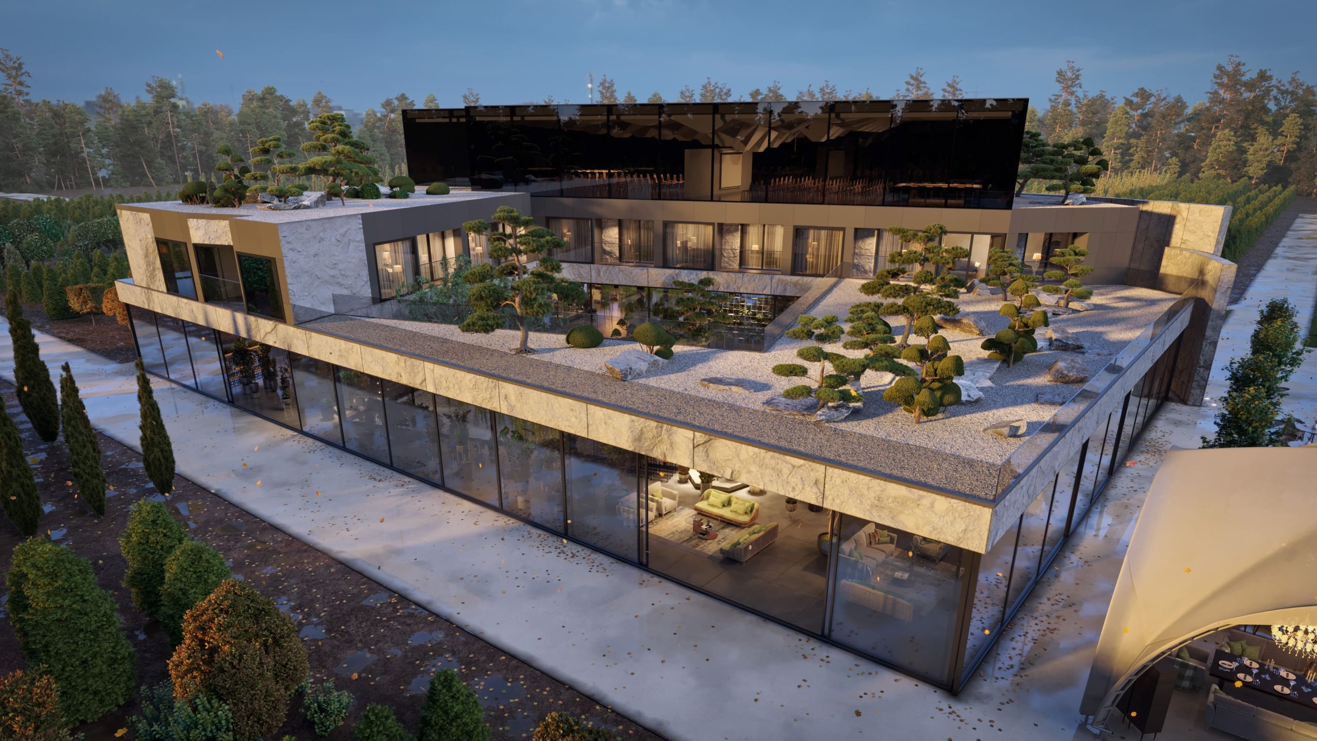 The team used solid natural stone slabs and panoramic glazing in the facades. As for the landscape of the courtyard, we made it in the Japanese garden’s style. Also, the exploited roof, which is also a part of an exhibition, is made in the same style.