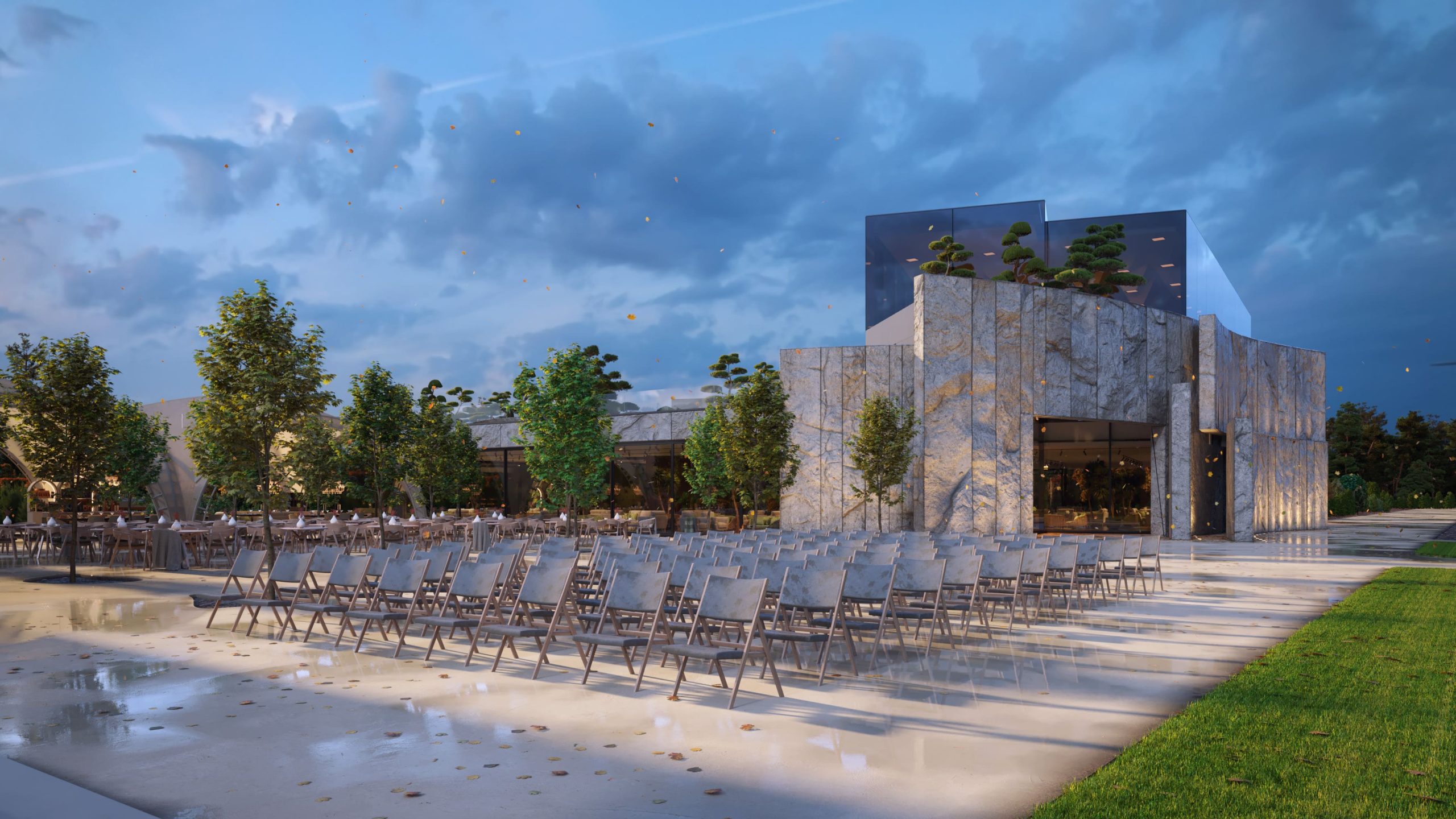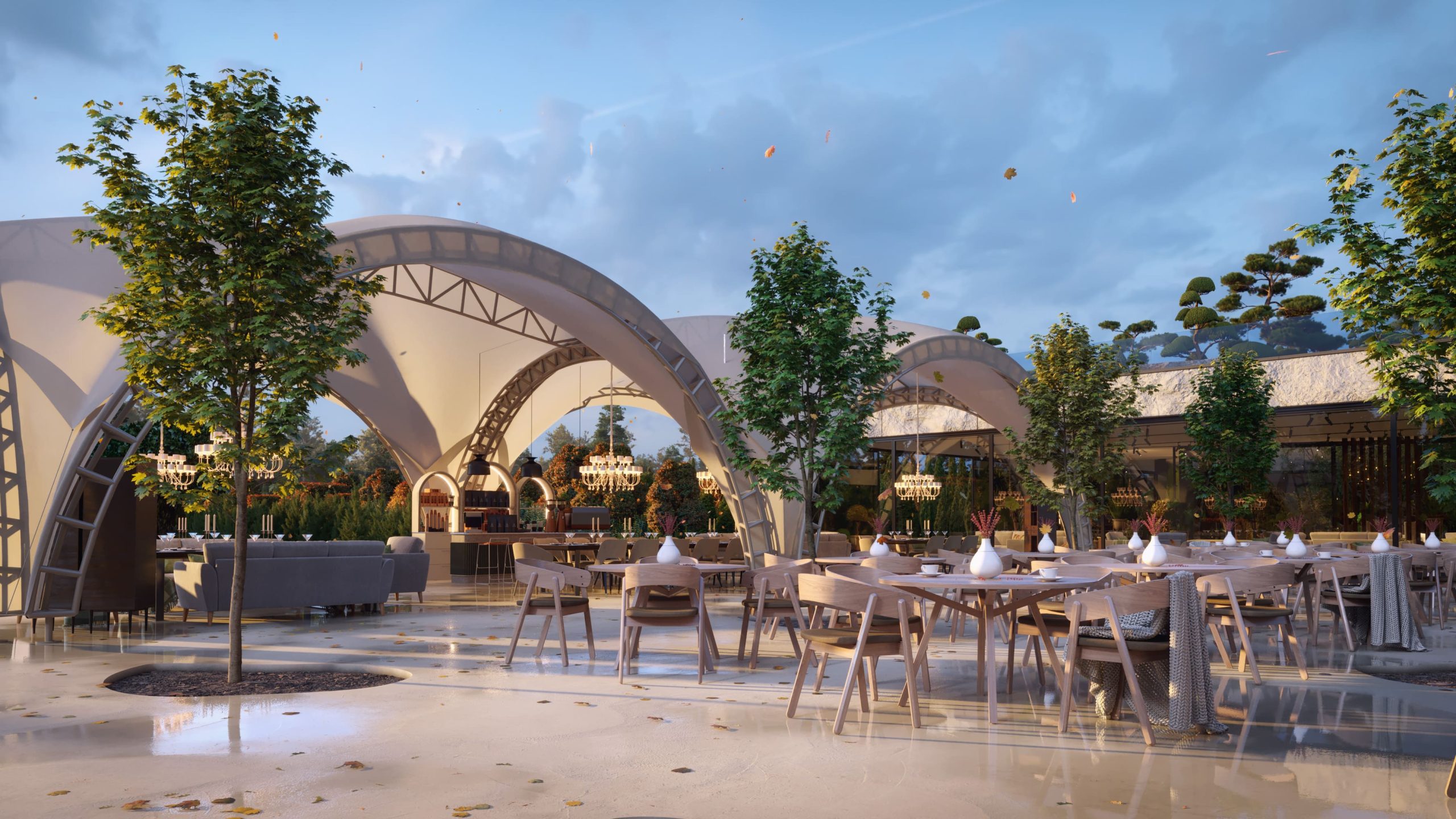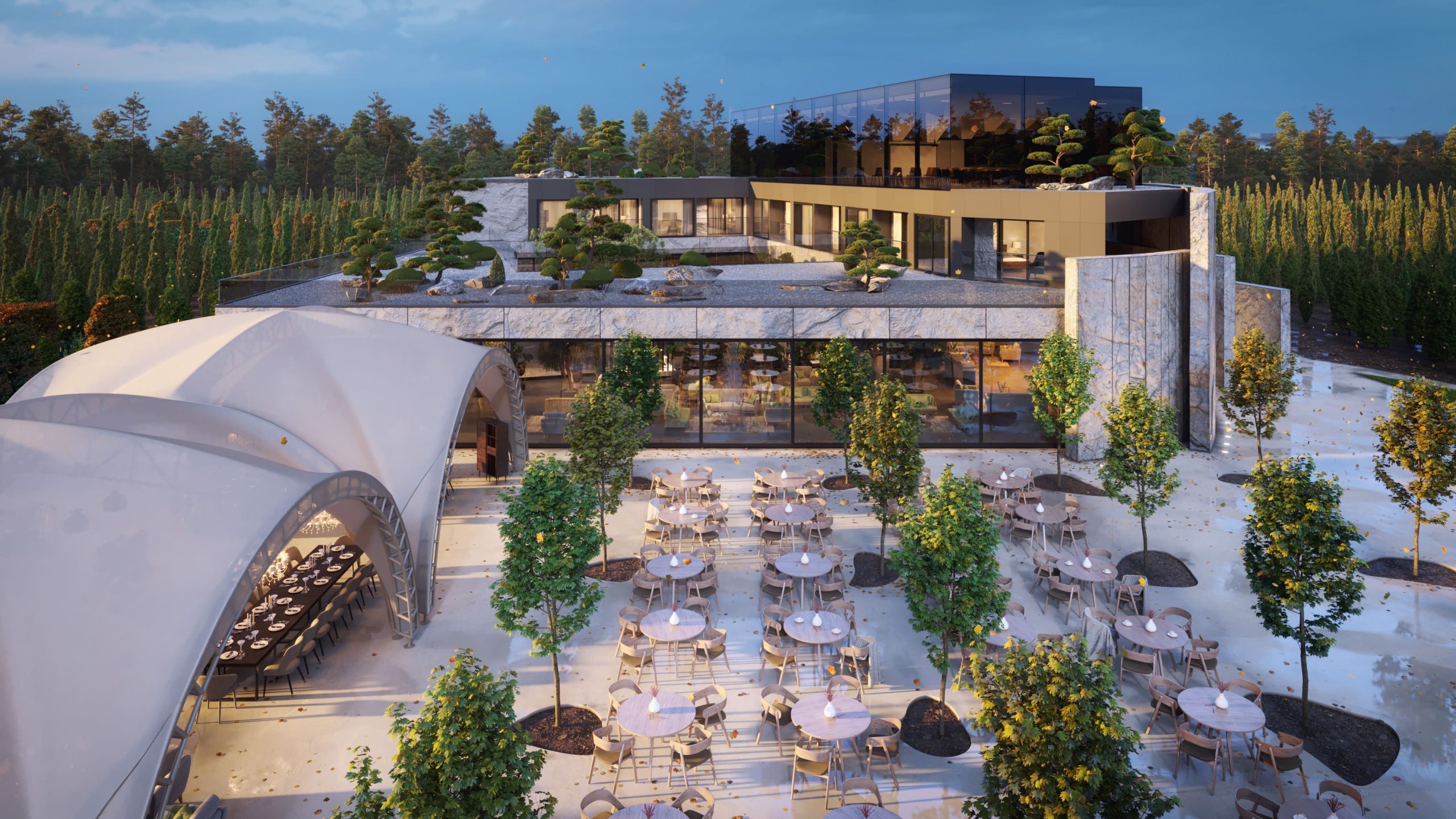 In front of the building, we equipped a large area with a covered tent and a stage for concerts. It will be possible to hold holidays, concerts, fashion shows, and private presentations.