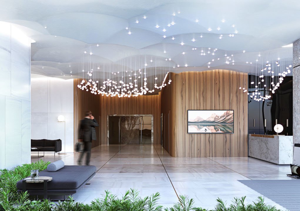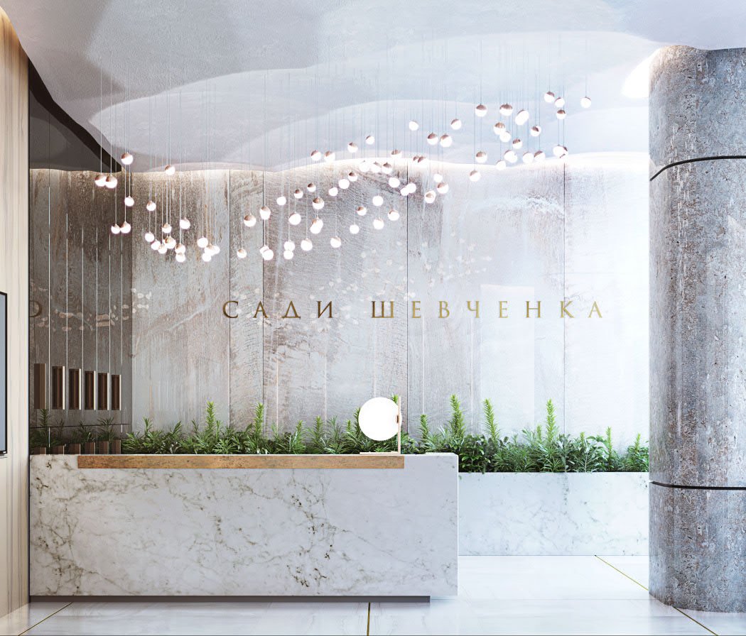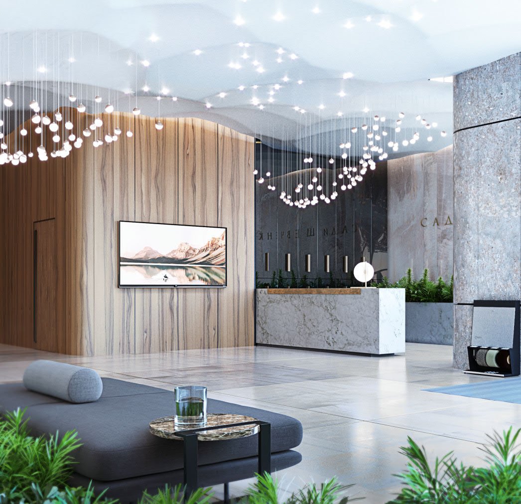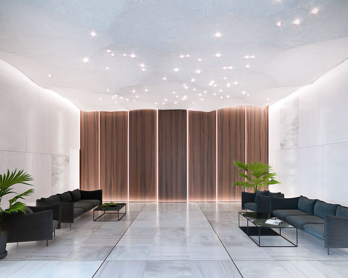There are mainly natural materials in the interior: Italian marble, alloy steel, and expensive wood. In the decor of the walls and floor, everything is subject to a clear vertical rhythm: from the pattern of wooden panels to the rays of hidden lighting.