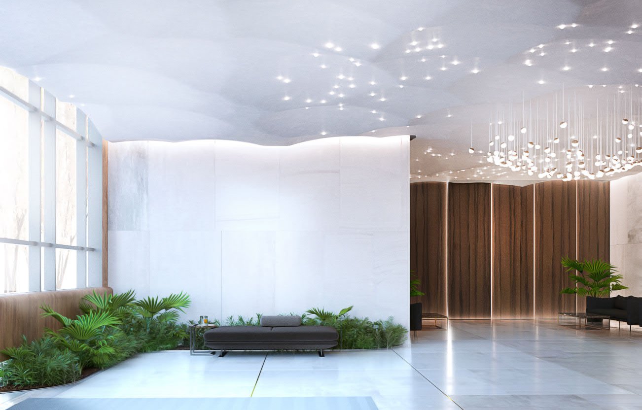 There are sofas and coffee tables located in the lobby for people who are waiting for someone. A lot of greenery was used in the interior, which stands out against the weathering steel and wooden wall panels.