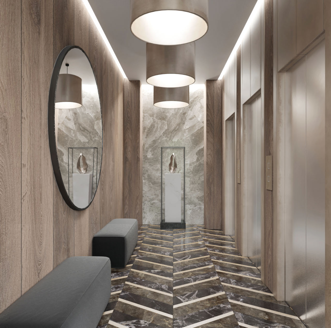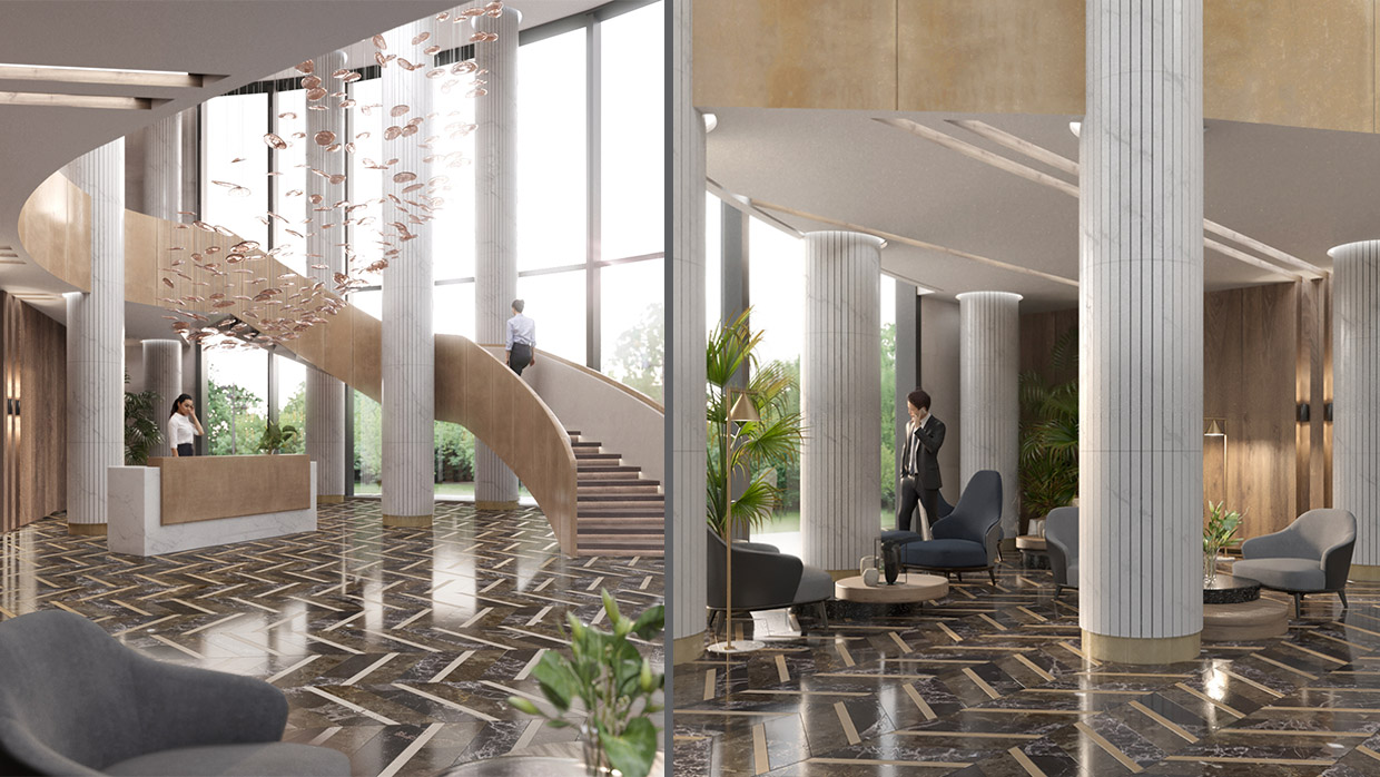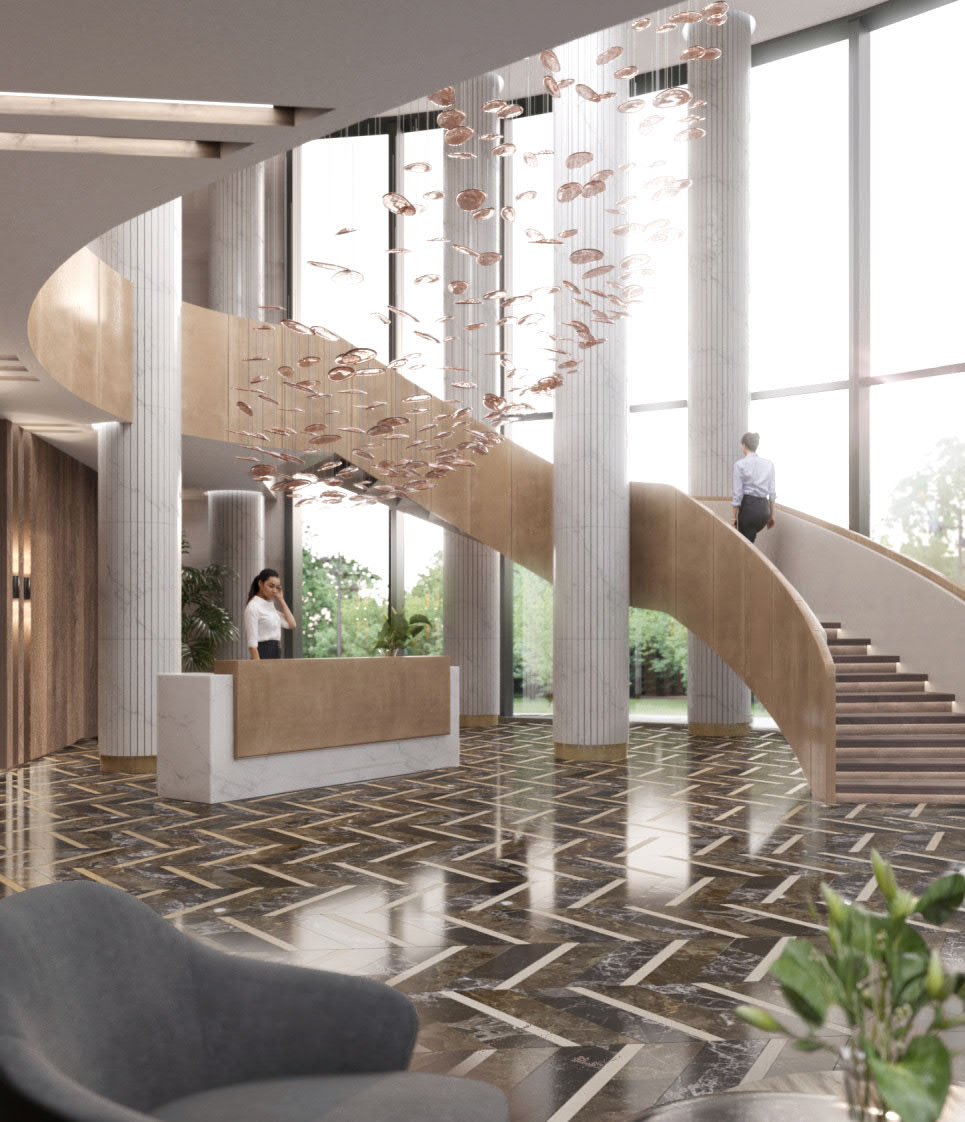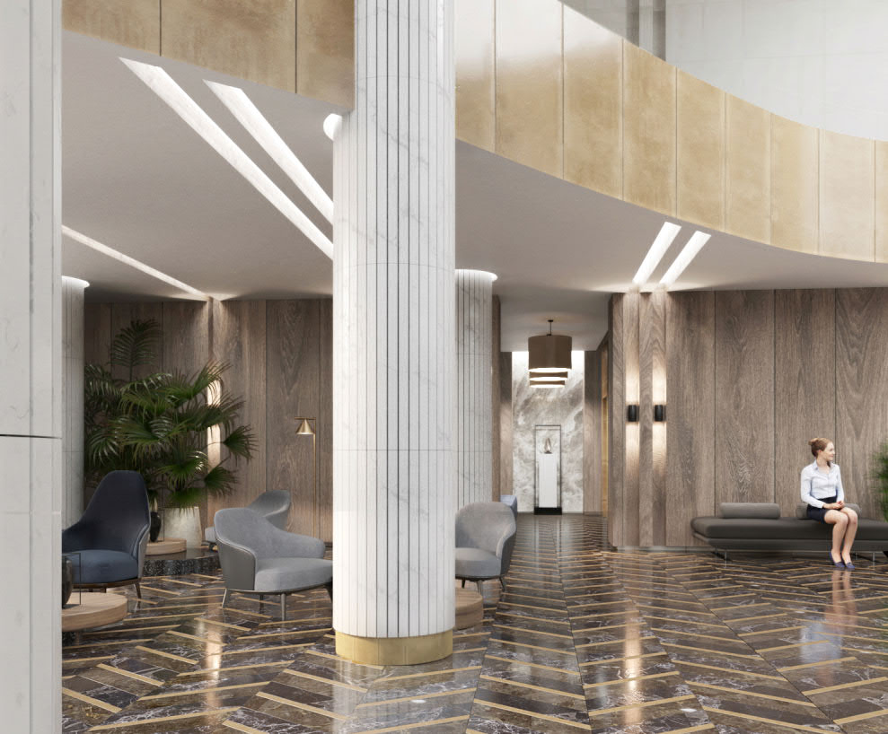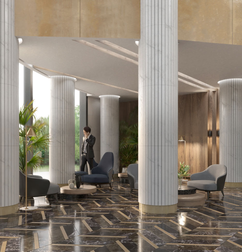 Due to the high slender columns, clad in elegant lamellae of white marble, the effect of spaciousness and purity of space is created in the lobby of the main entrance. Thanks to the general glazing and the second light, the entire space of the lobby is flooded with sunlight with numerous plants that look very organic.