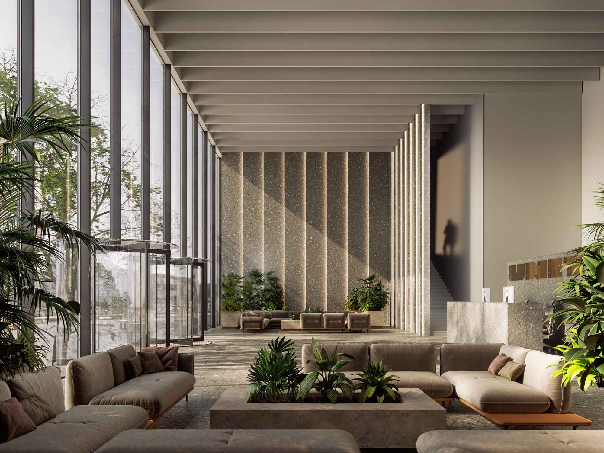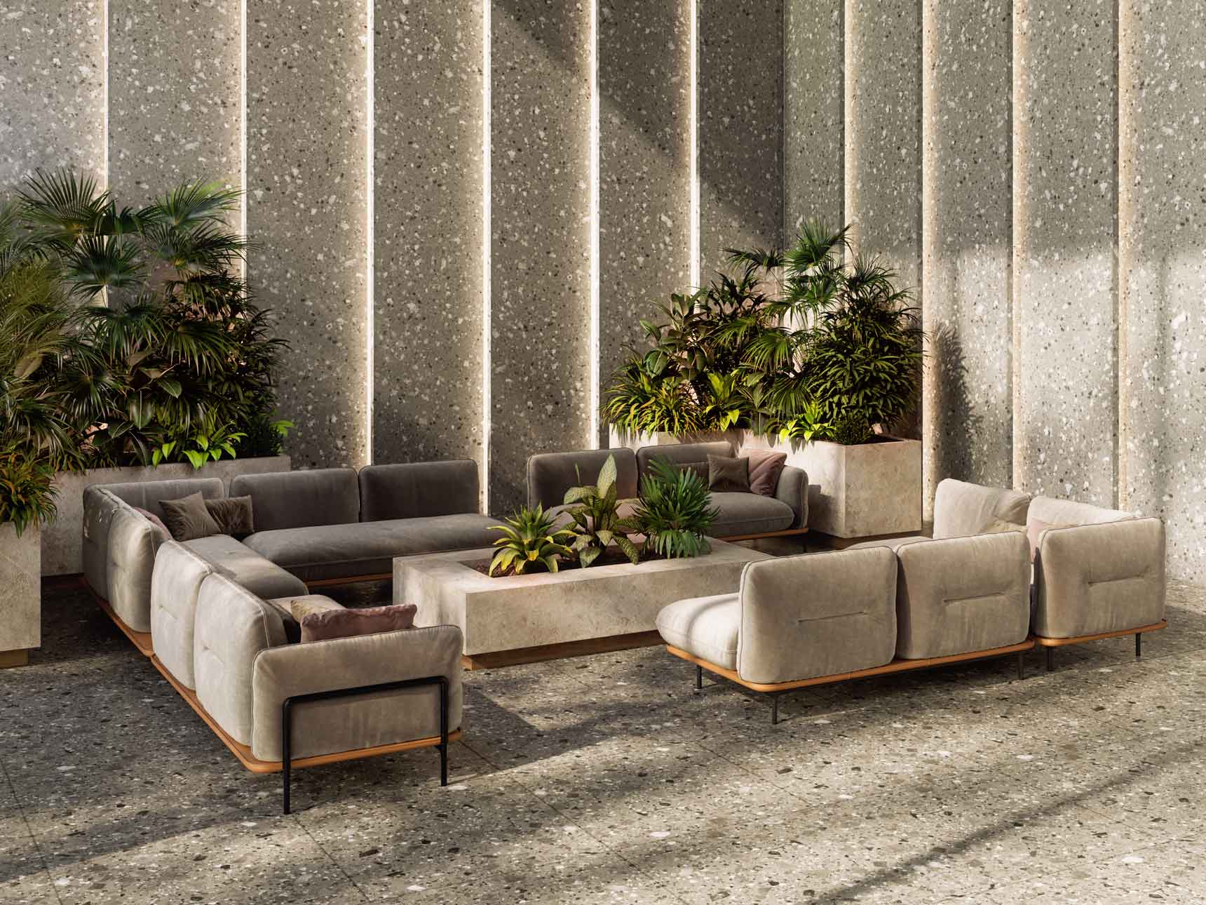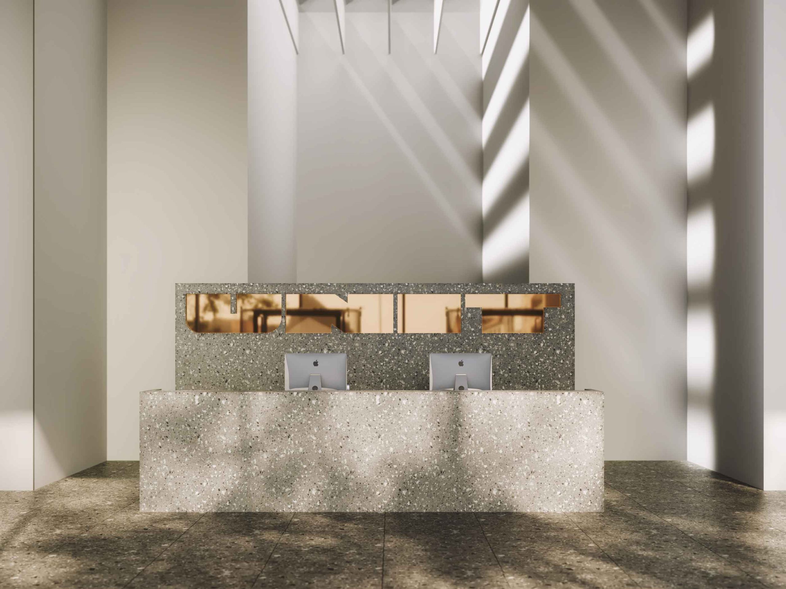Mono material is a principle we used in the architecture of interiors working on this object. Walls, ceiling, and reception are made from terrazzo, trendsetter 2018-2019. Large elements, hidden lighting, leather furniture, and a flower pot with plants set the basic character of the interior: rise to the top.