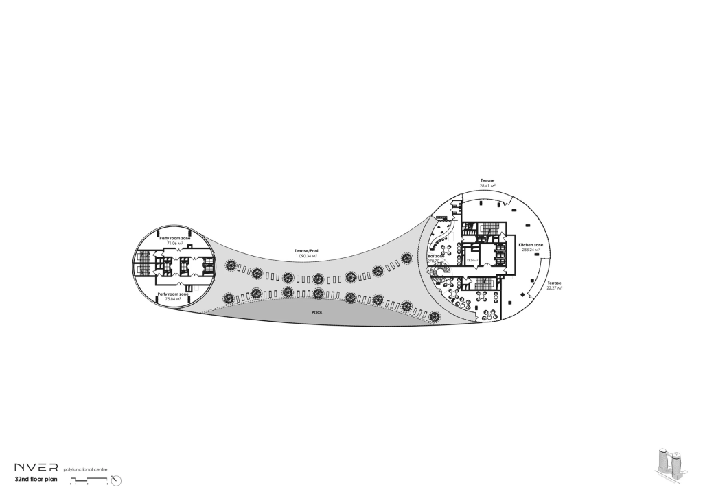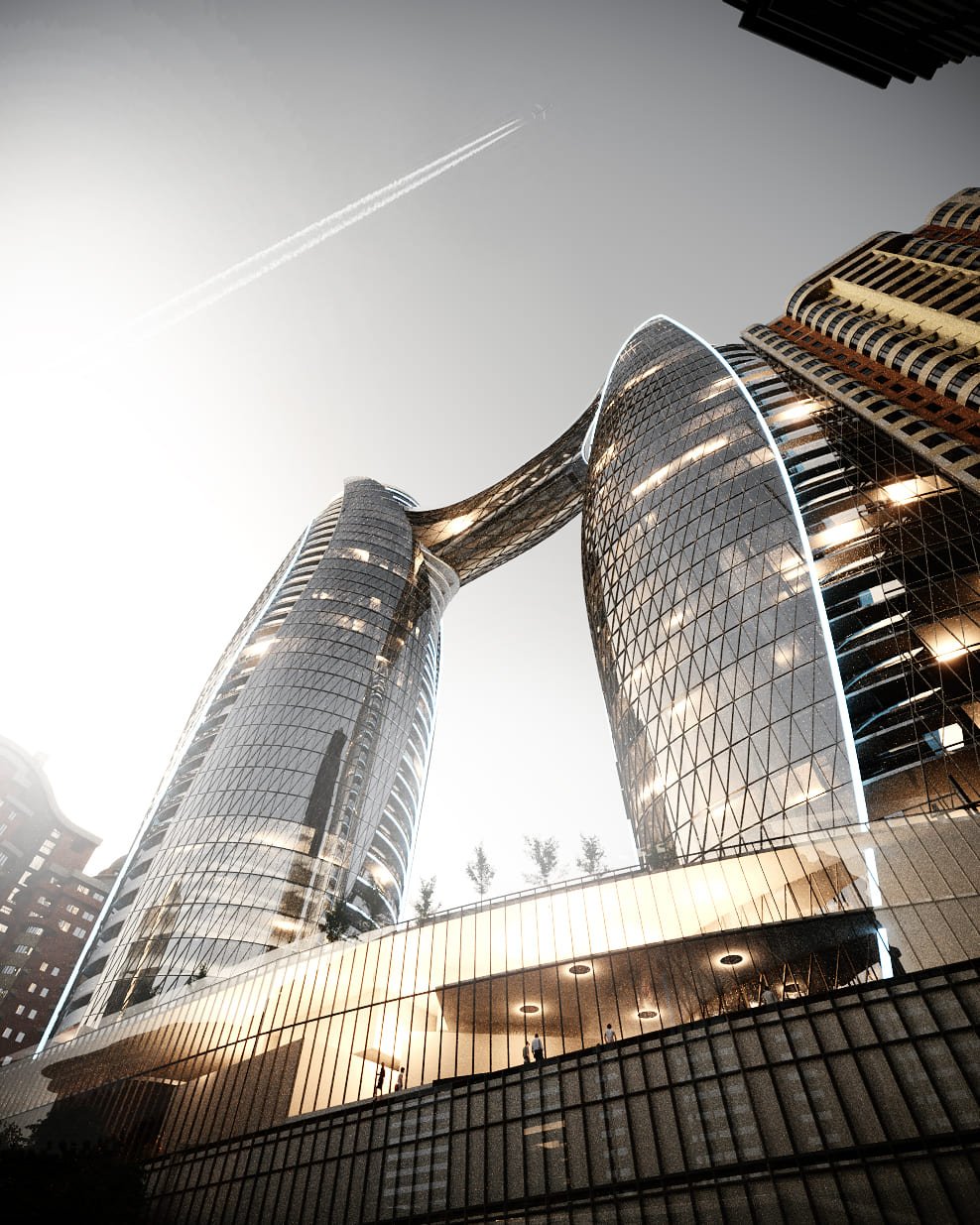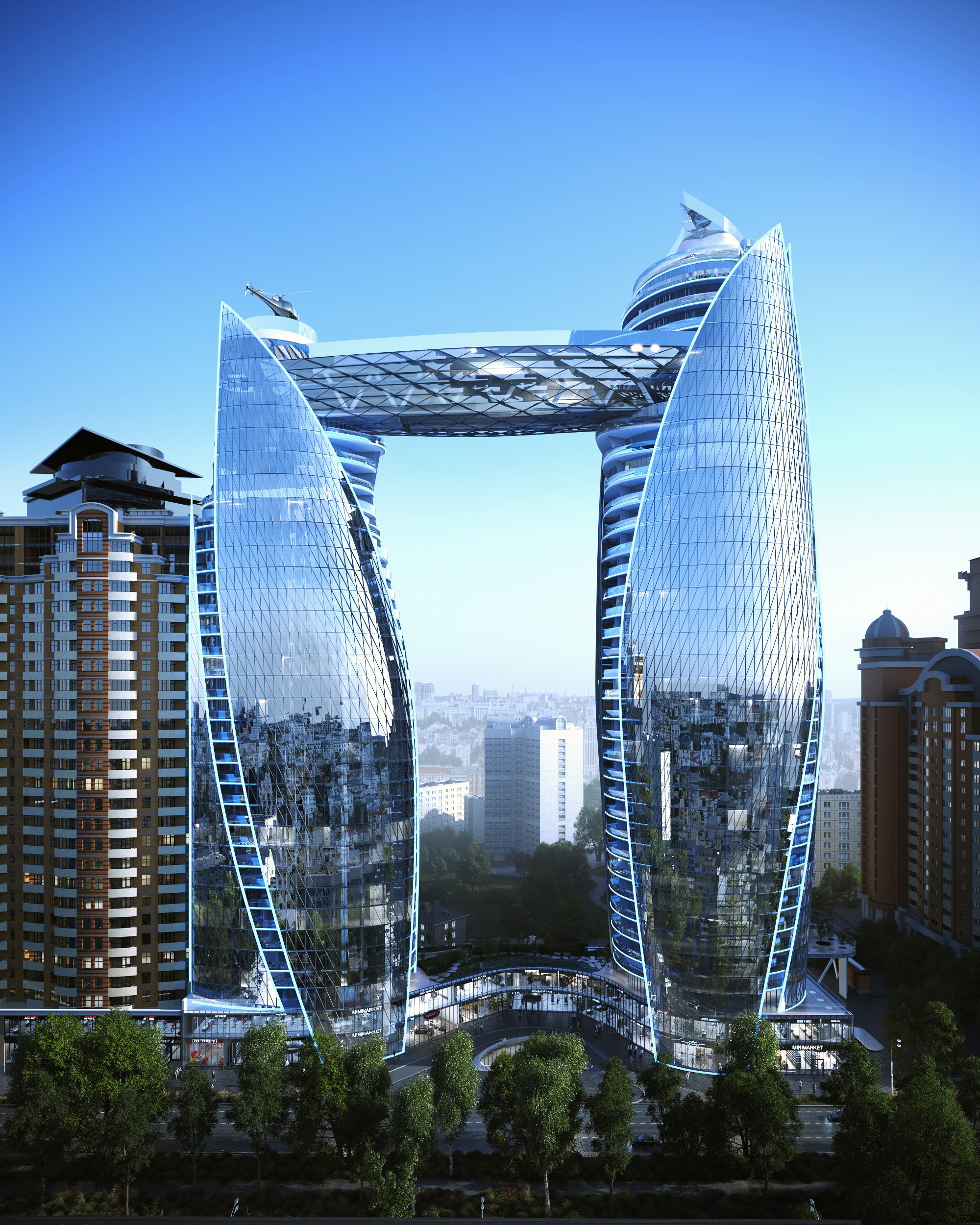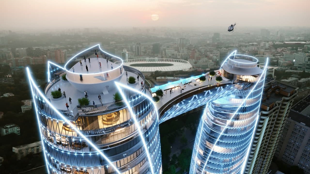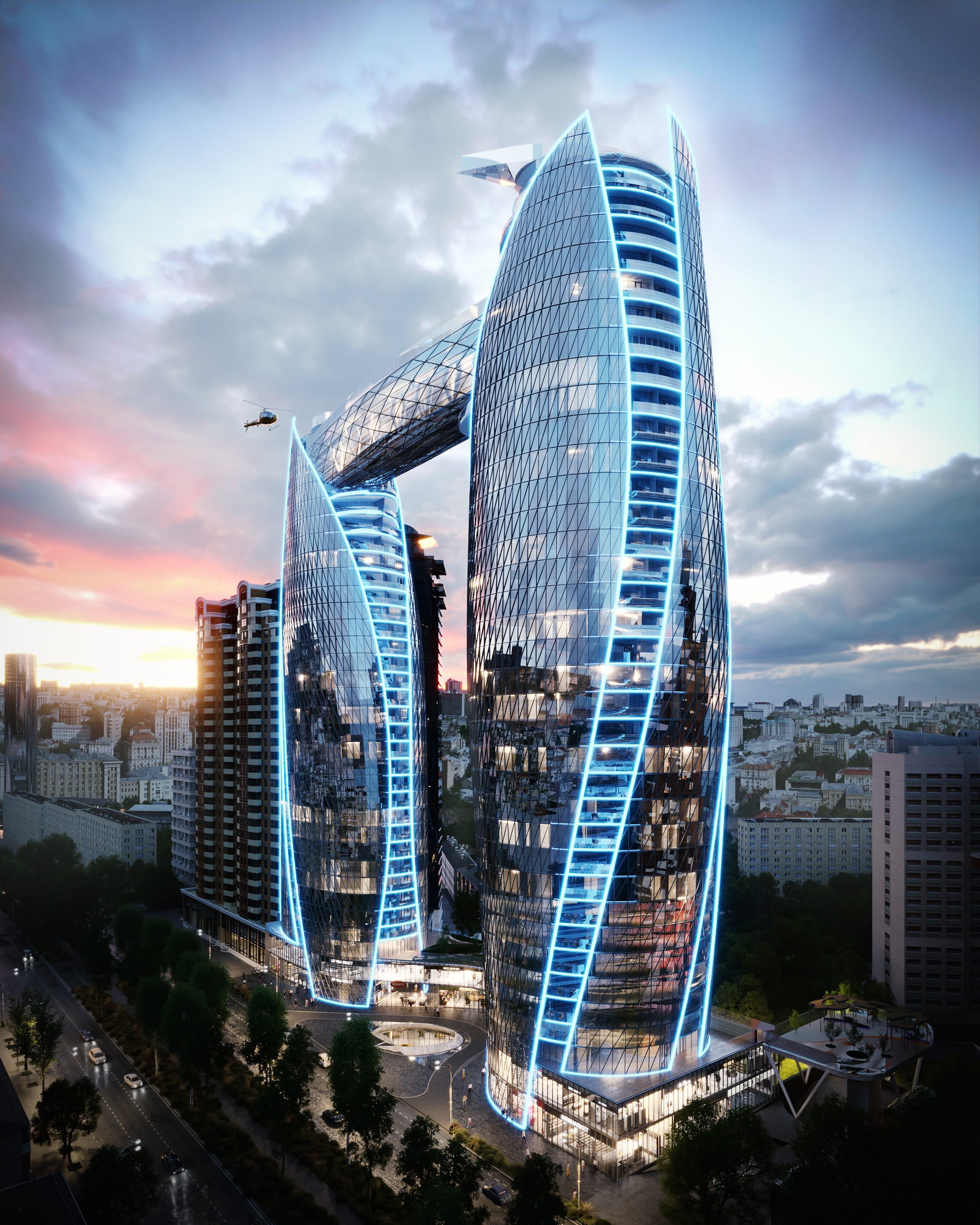 The main design of the building is the soaring petals-roofs, which embrace the towers and the 50-meter bridge with two pools – inside and open on the roof of the bridge. This solution for residential and public buildings is the first of its kind in the world. It will allow it to become an architectural symbol of Kyiv and the whole of Ukraine.