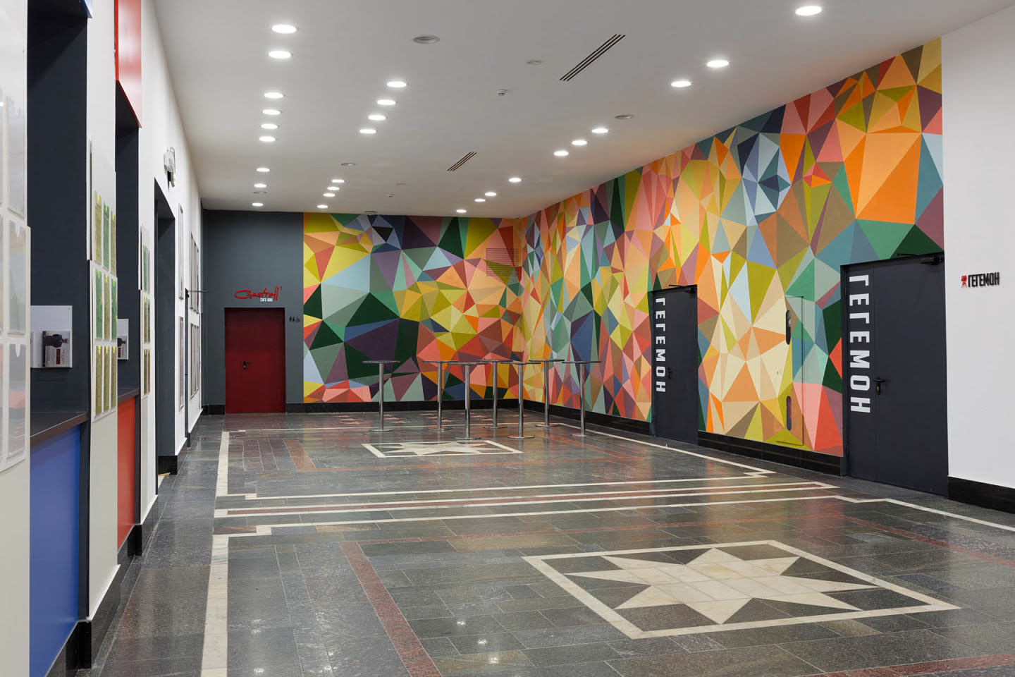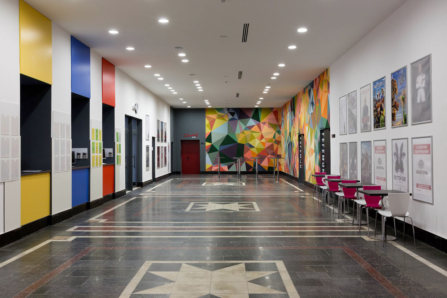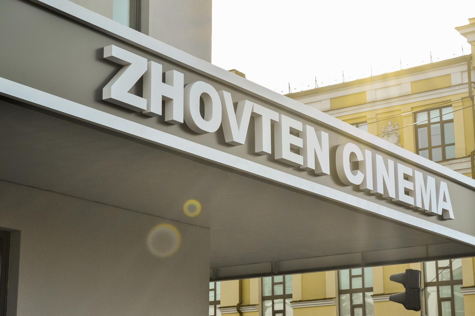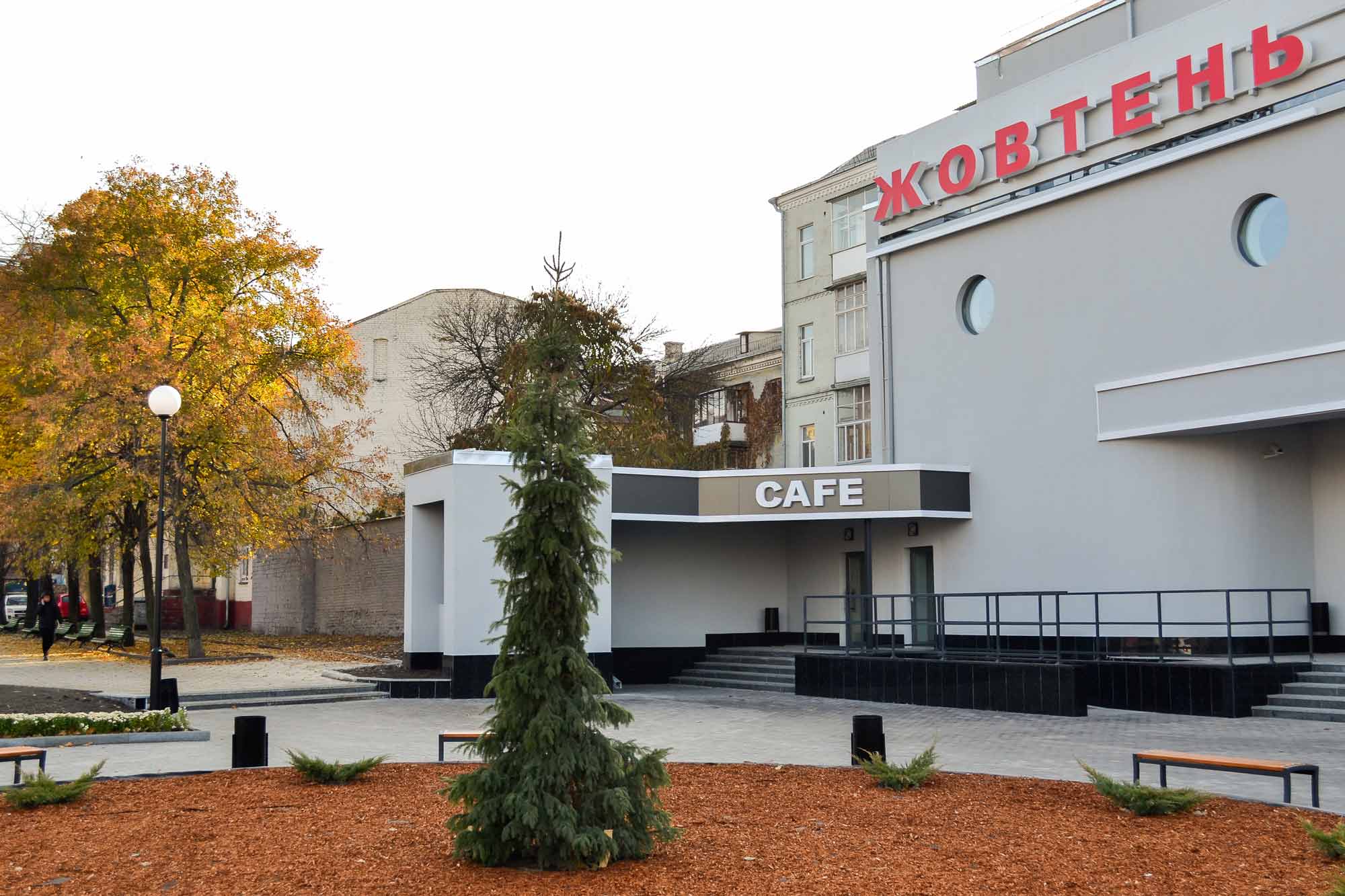 Therefore, it was decided to keep the same color that everyone already remembered. The additions of a dark gray color in the form of the cinema and slightly different sign design, now located at the intersection of streets, became small changes. The sign above the main entrance was colored in red. Such a choice favorably distinguishes the name, attracts the attention of passers-by, and salutes the old Zhovten.