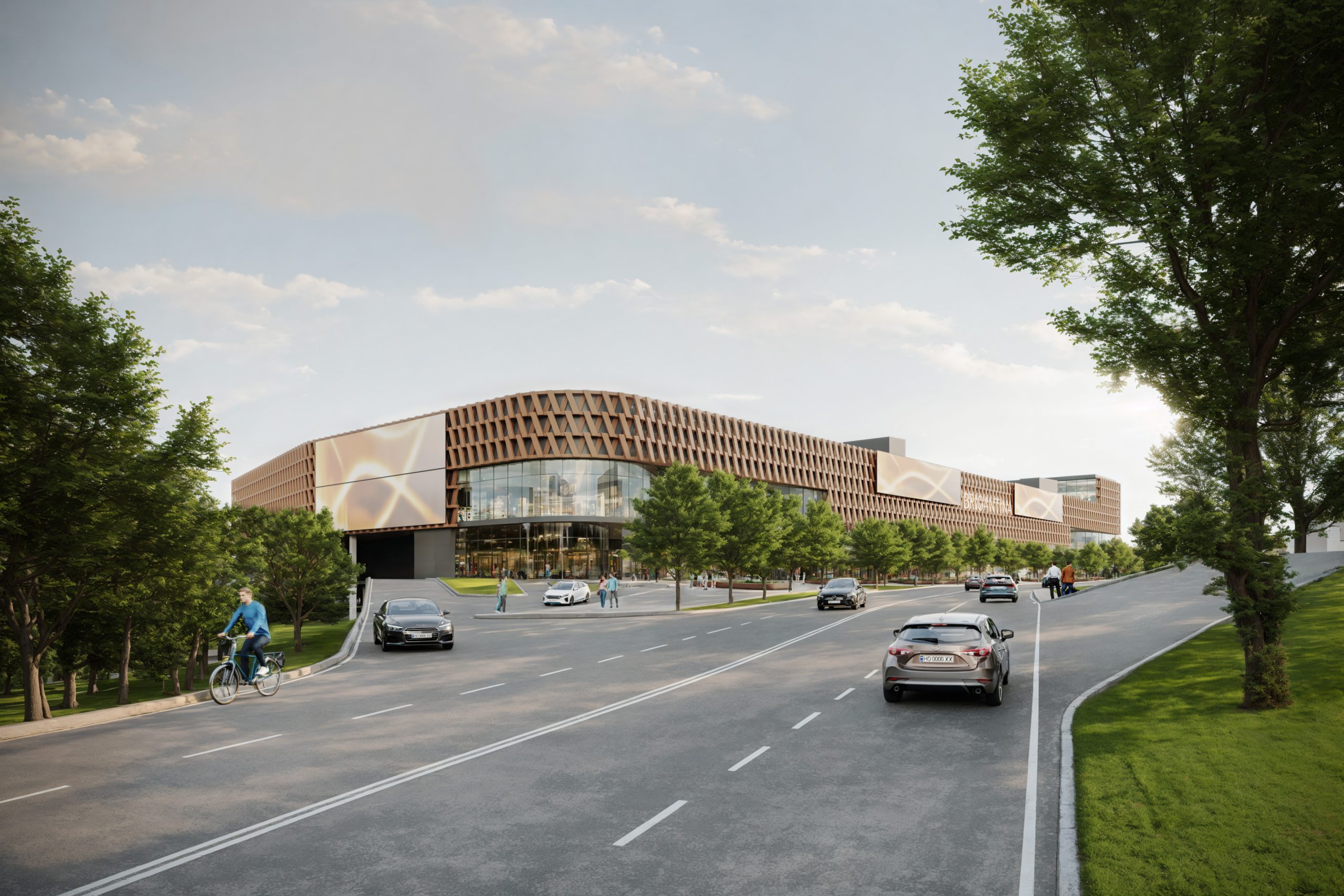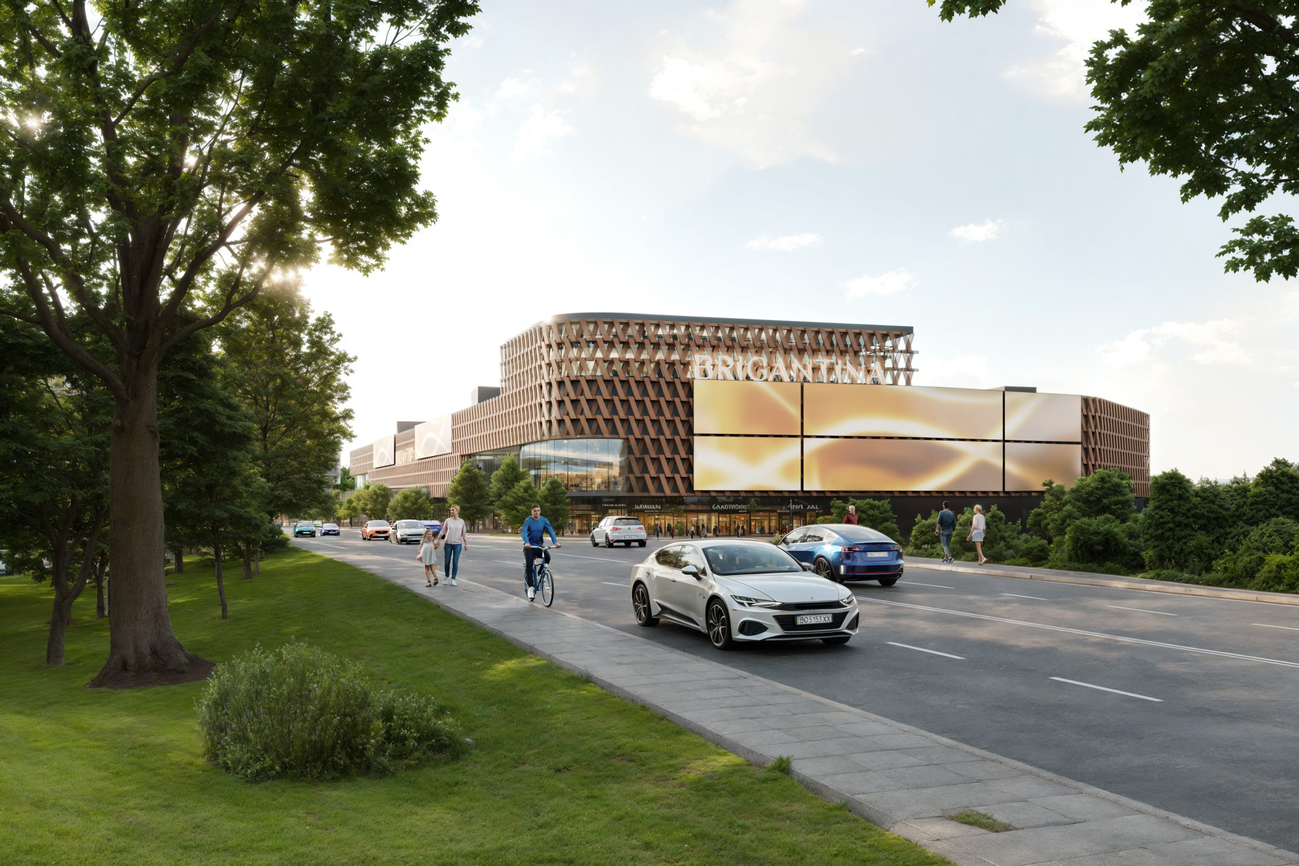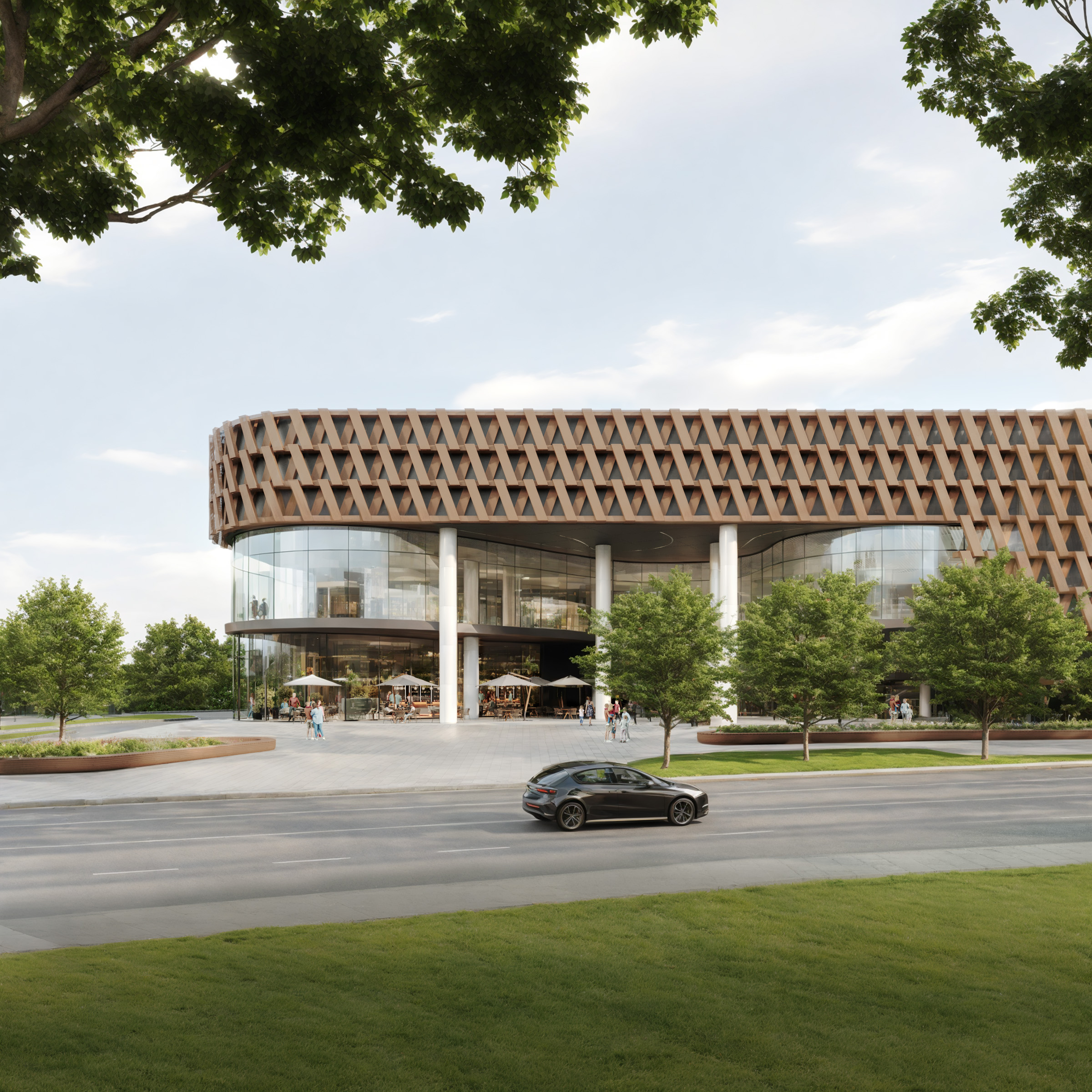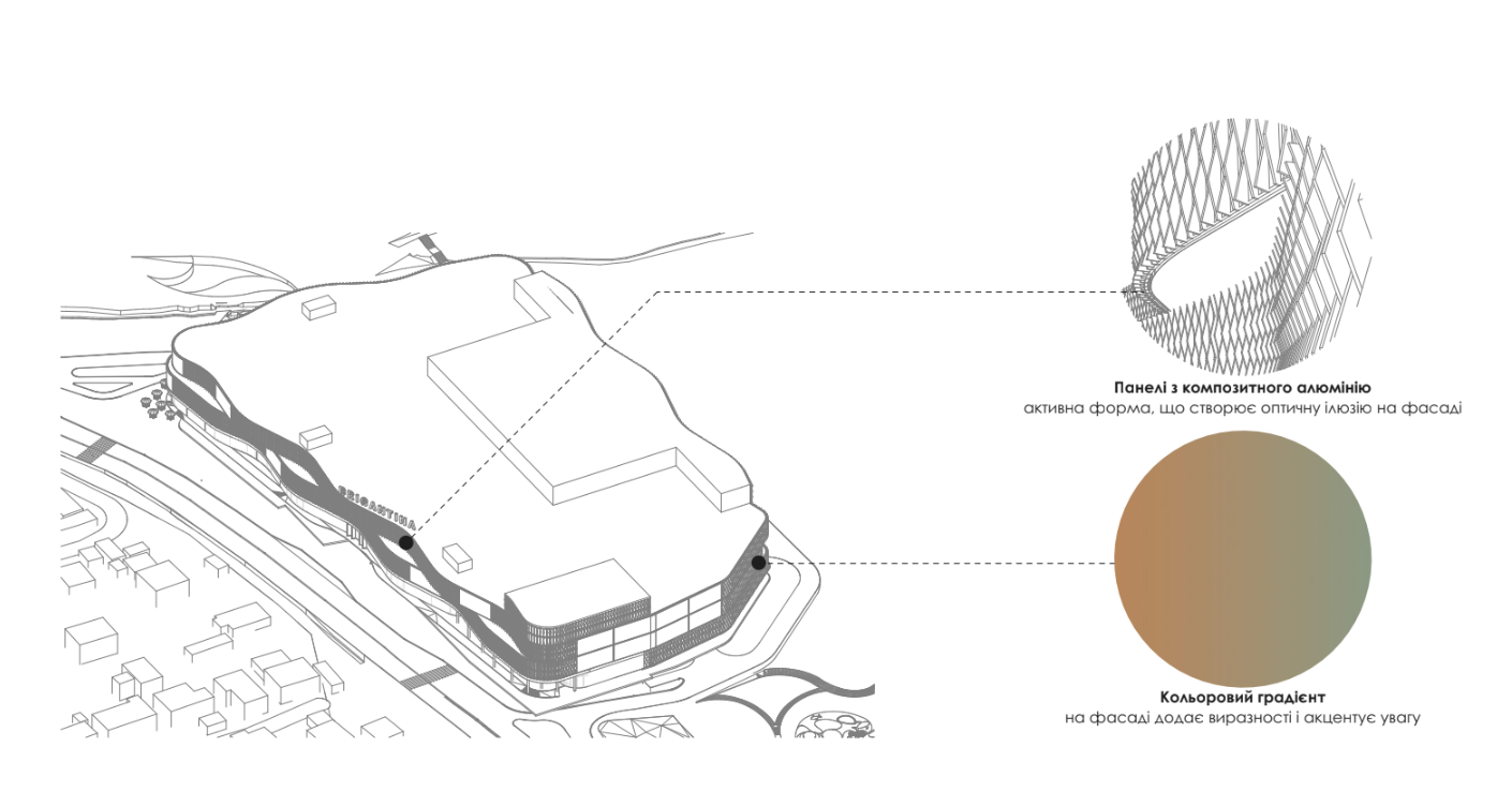 This architectural project is a modern shopping and entertainment center in Vinnytsia. The building features a sleek, curved façade, giving it a futuristic yet elegant appearance. Large glass windows on the ground floor create a welcoming atmosphere, connecting the interior with outdoor seating areas. The design integrates greenery and open spaces, enhancing the urban environment. Its innovative aesthetic and functional layout make it a key landmark for shopping, leisure, and social interaction in the city.