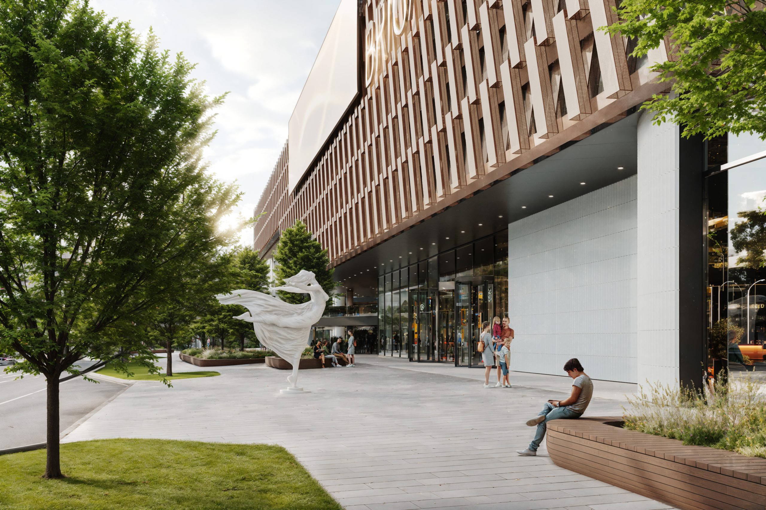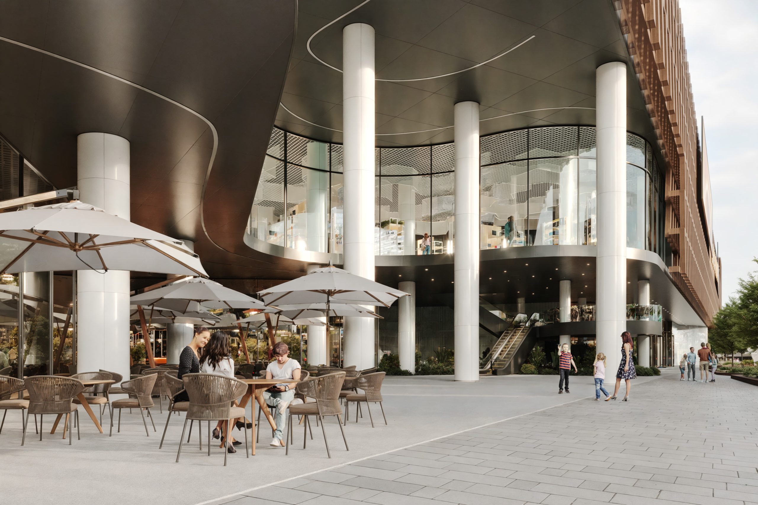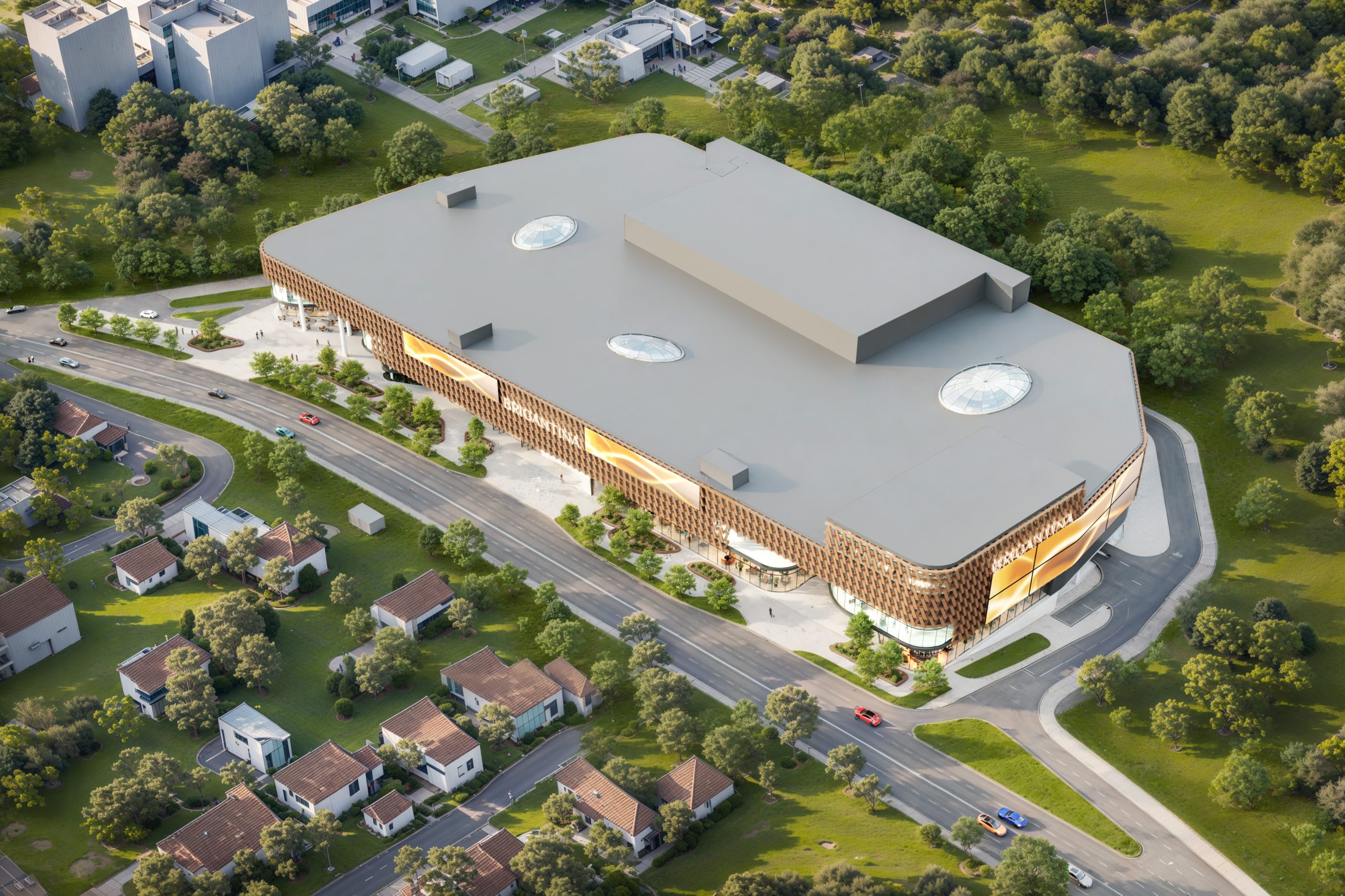 This architectural project is a modern shopping and entertainment center in Vinnytsia. The building features a sleek, curved façade, giving it a futuristic yet elegant appearance. Large glass windows on the ground floor create a welcoming atmosphere, connecting the interior with outdoor seating areas. The design integrates greenery and open spaces, enhancing the urban environment. Its innovative aesthetic and functional layout make it a key landmark for shopping, leisure, and social interaction in the city.