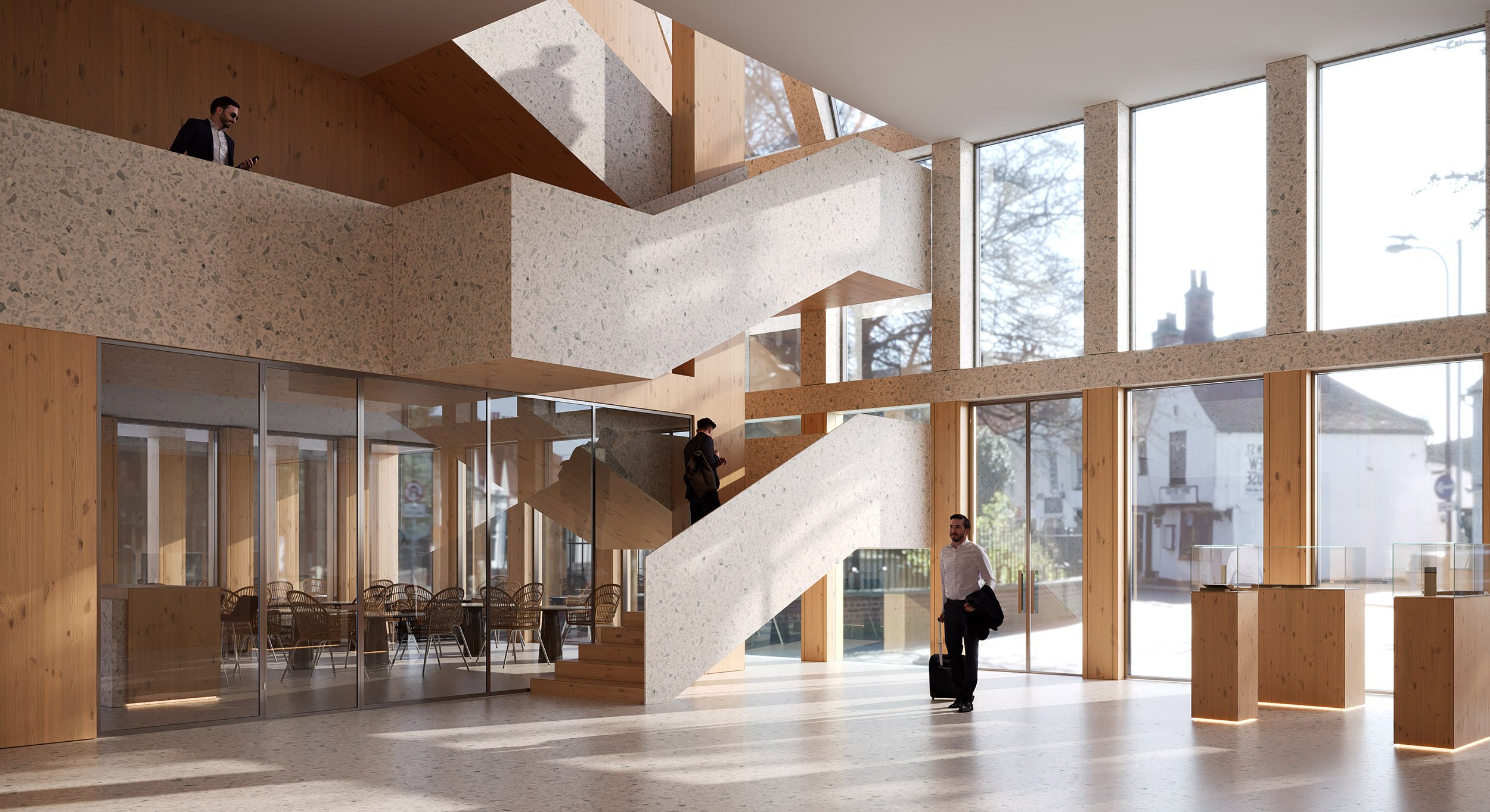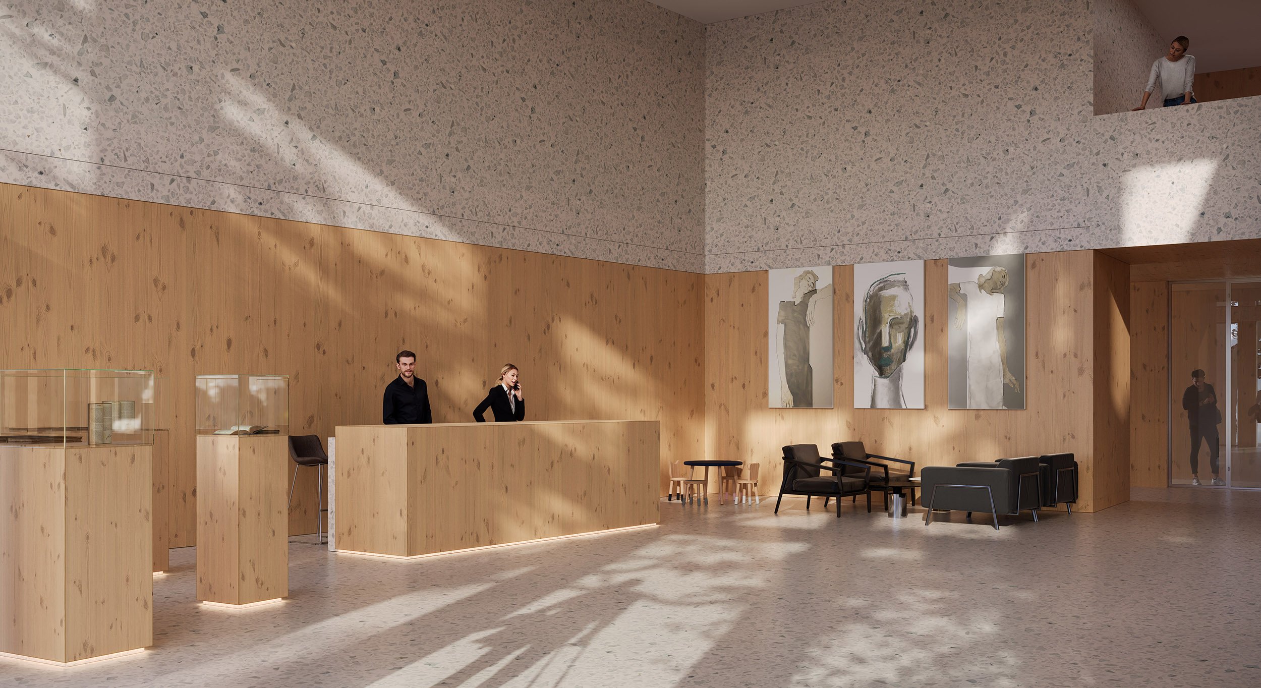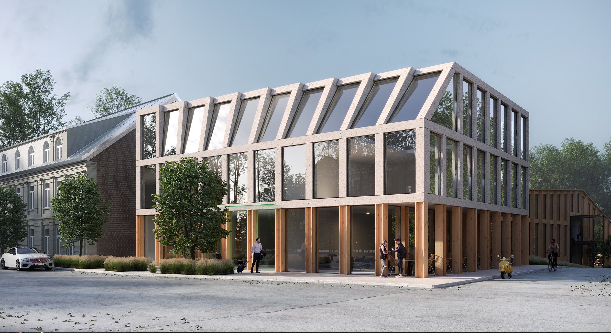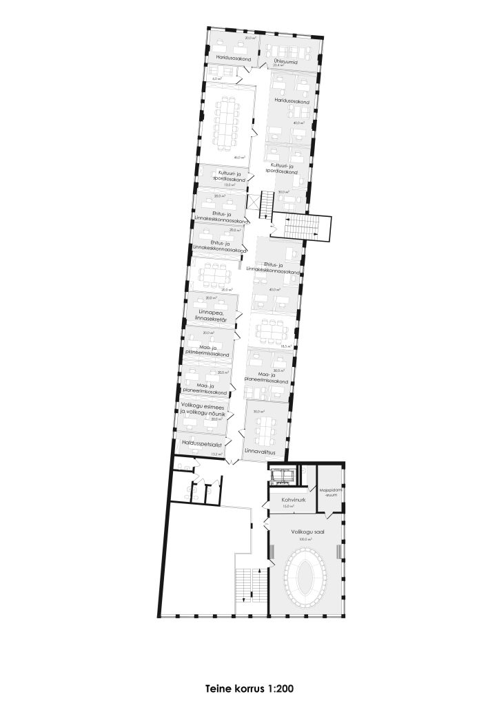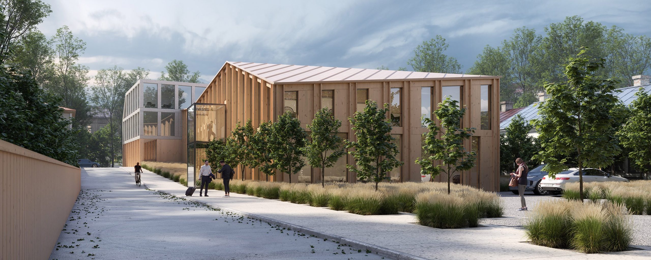 When designing the architectural volume of the building, the materials of the surrounding buildings were adhered to, mainly stone and wood. These materials are reflected in the interior, architecture, and landscape design, creating a harmonious environment around the city council building.