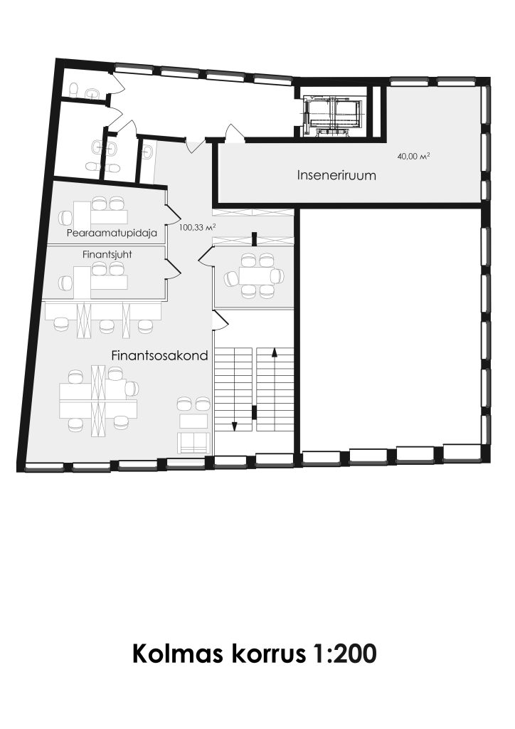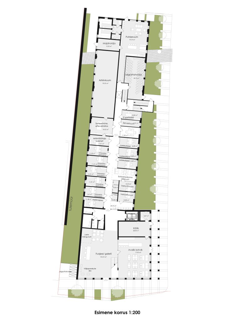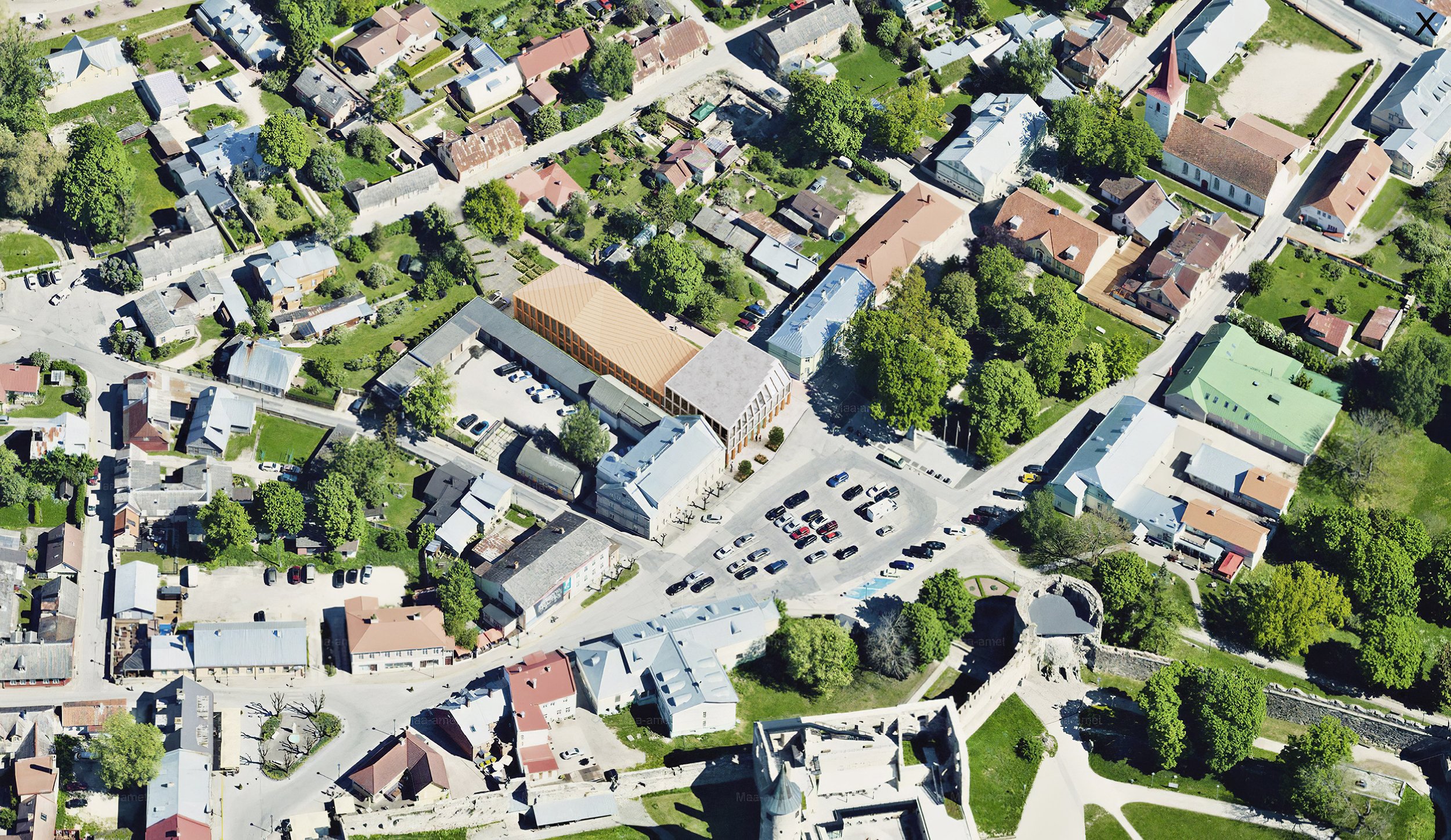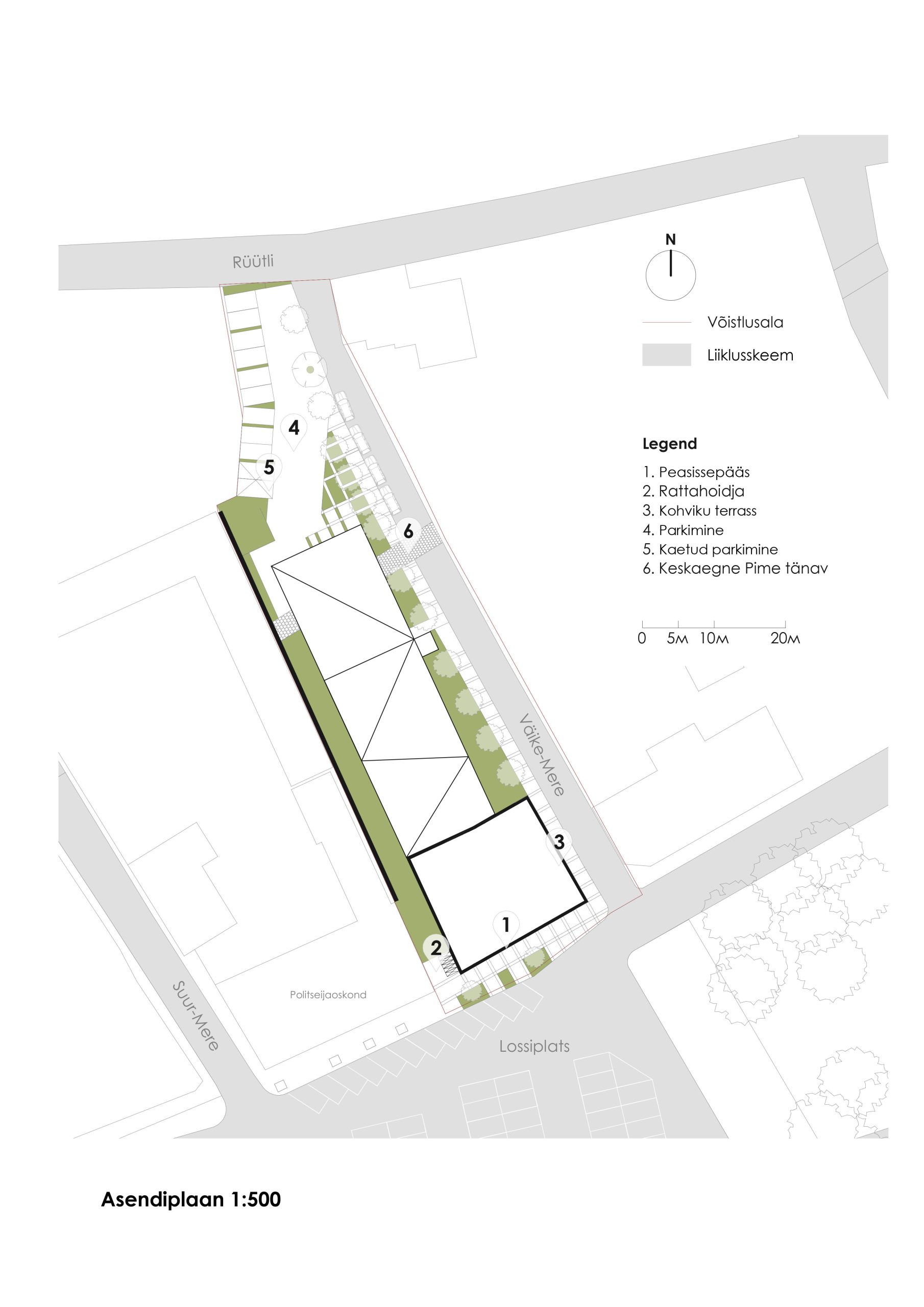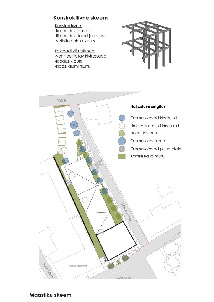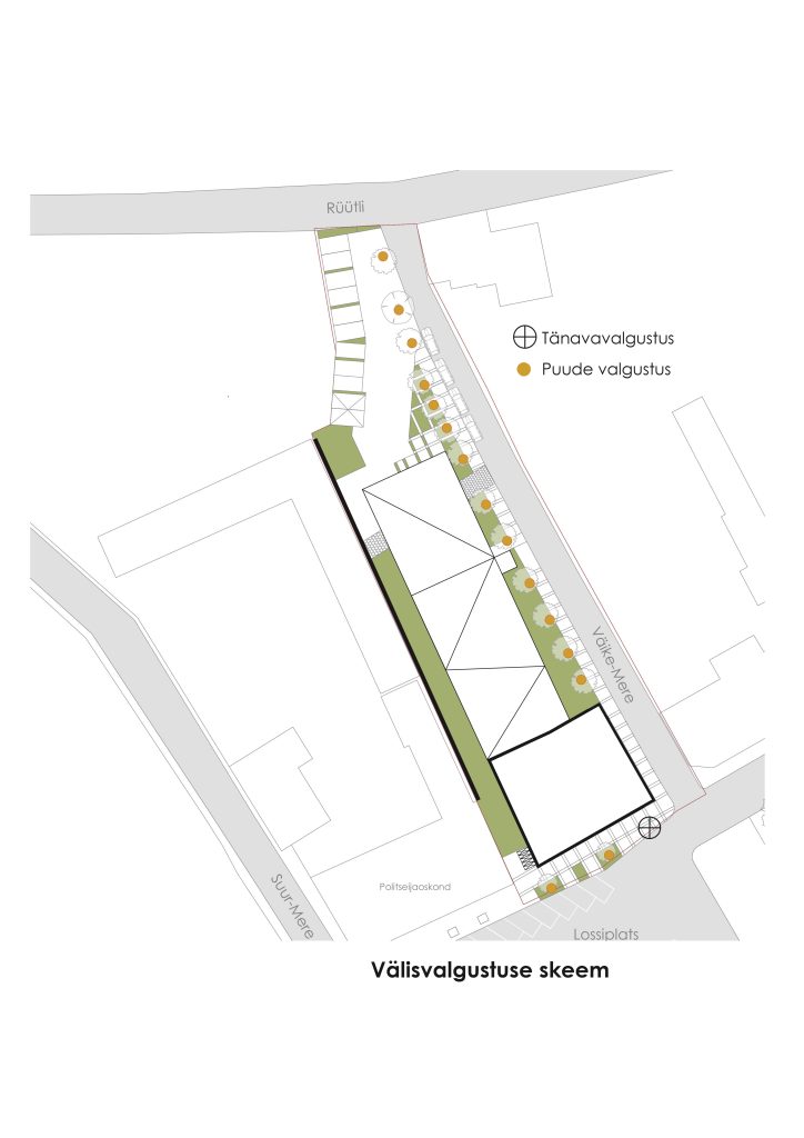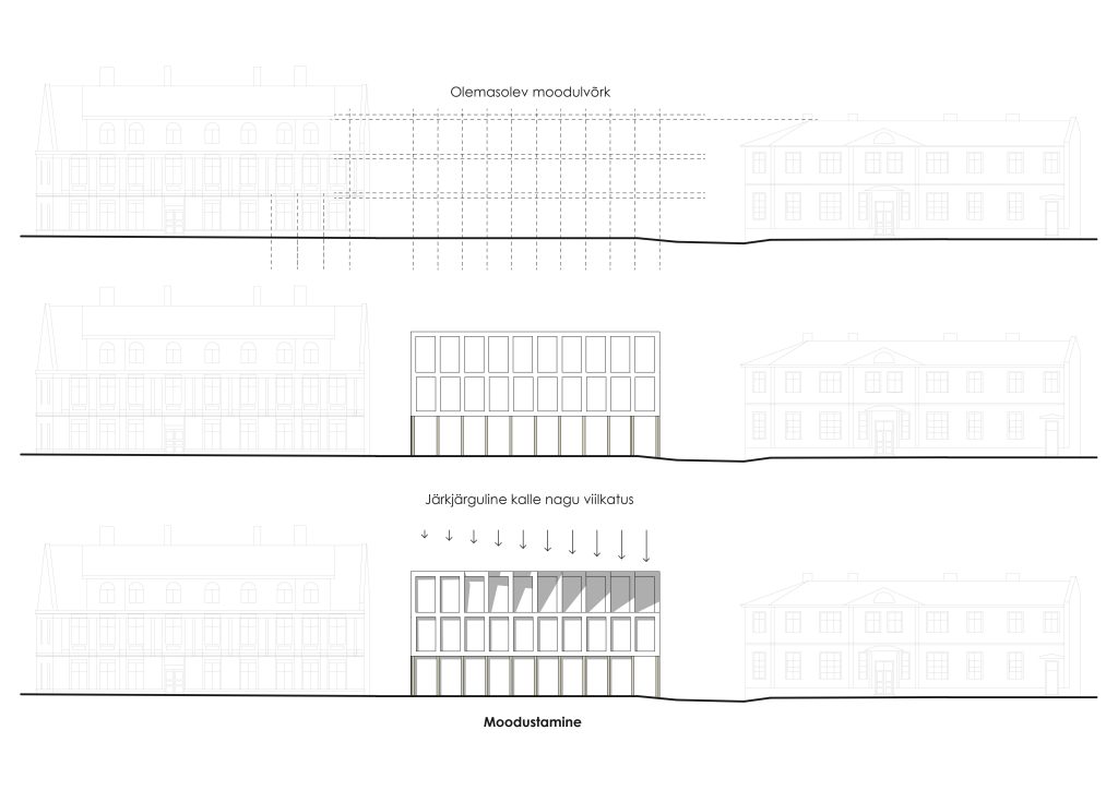 The building is located within the Museum Zone of Haapsalu, on one of the main central squares, Lossi plats. The project site borders with the police building, which has a dominant attic floor, the height of which is one and a half times higher than the usual floor height. The proposed building has two floors with a dynamic “floating” third floor, which reproduces a historical image, correlating with the building located across Vyike-Mere Street. The designed building curves and “floats” along Vyike-Mere Street and leads to the sea boulevard to the north.