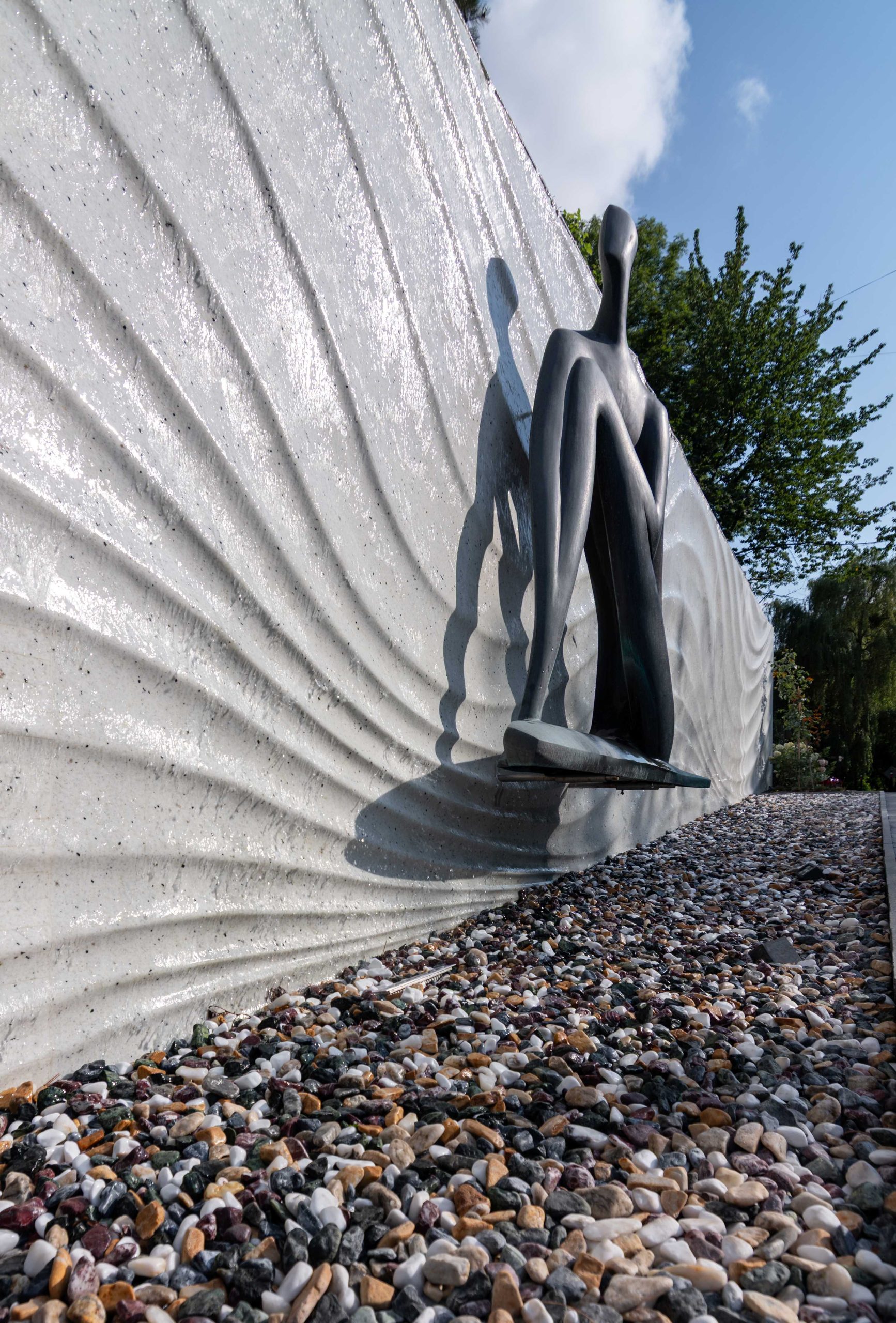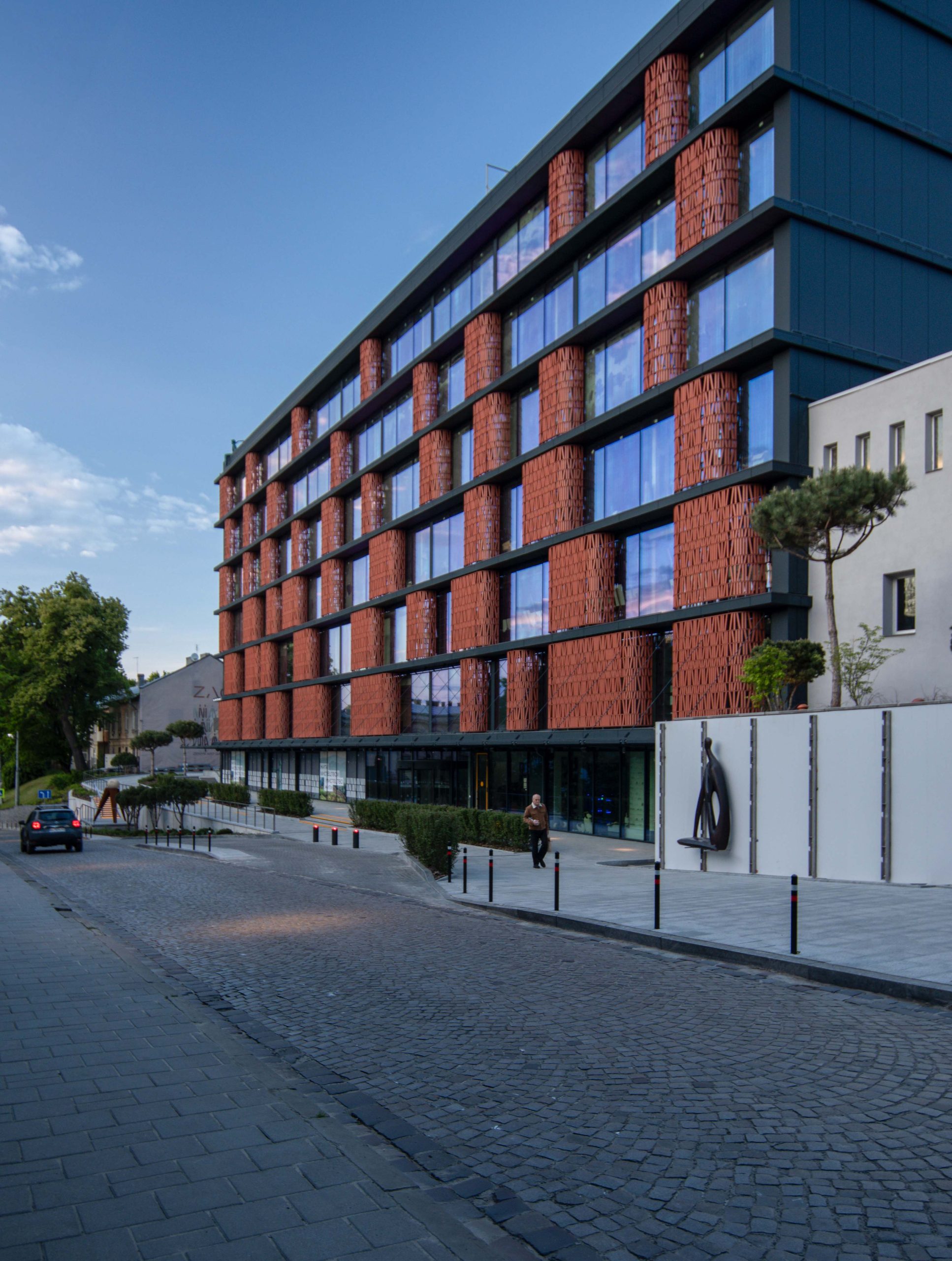 The design utilizes a graduated glazing ratio: upper floors feature extensive glazing, while the lower levels incorporate more solid elements. This approach lends the building tectonics and provides visual balance. The surrounding landscaping is seamlessly integrated into the overall exhibition space, serving as an open-air display for art objects.