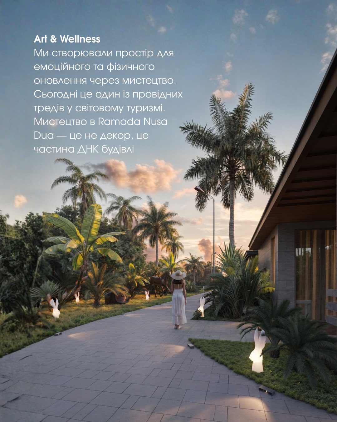 Ramada Nusa Dua is the first branded art hotel in Nusa Dua, Bali, embodying the global Art & Wellness trend. The AIMM team has created a complex where art is woven into its very DNA. We developed an architectural concept that transforms the hotel into a living gallery for emotional renewal, masterfully integrating five-star amenities: a spa, a restaurant, a coworking space, an art rooftop, a fitness center, and swimming pools.