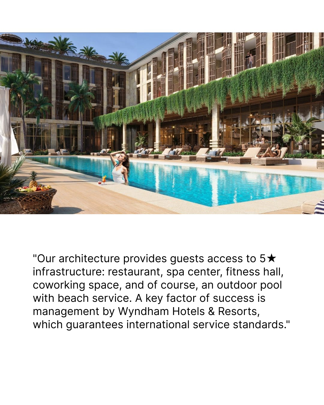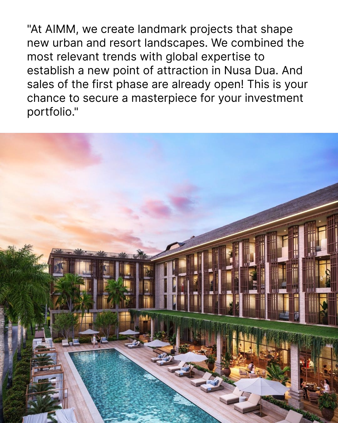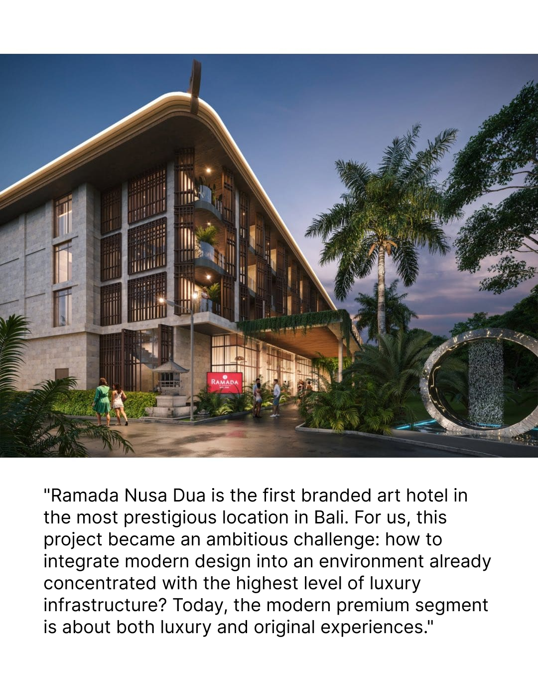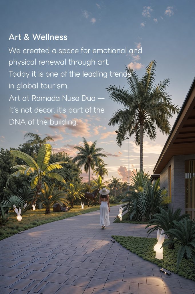 Ramada Nusa Dua is the first branded art hotel in Nusa Dua, Bali, embodying the global Art & Wellness trend. The AIMM team has created a complex where art is woven into the very fabric of the property. We developed an architectural concept that transforms the hotel into a living gallery for emotional renewal, skillfully integrating five-star amenities: a spa, restaurant, coworking space, art rooftop, fitness center, and pools.
