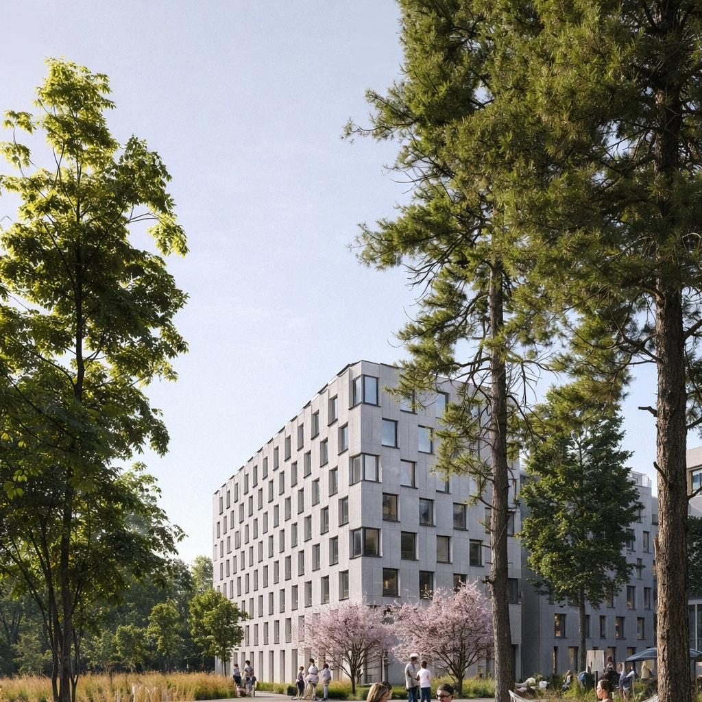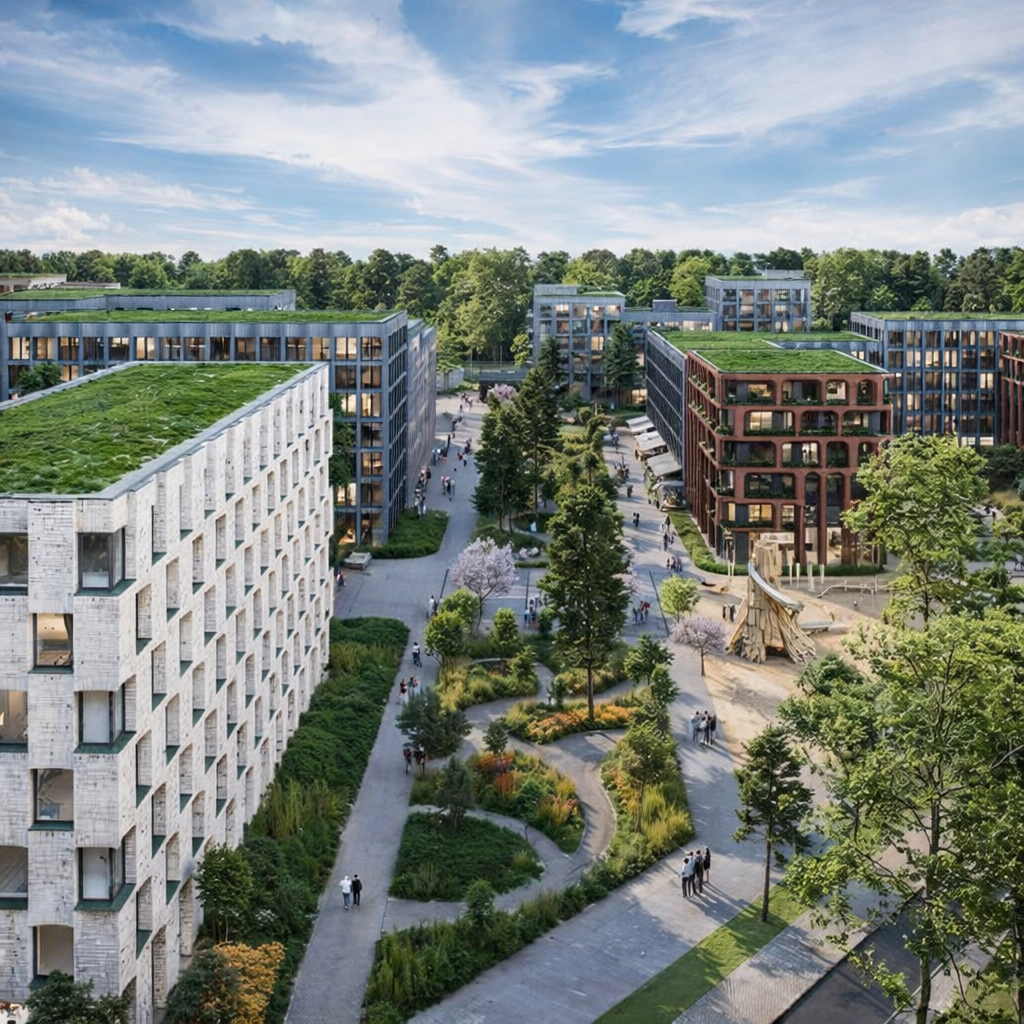 A cozy low-rise neighborhood development with comfortable amenities, green roofs, and varying building heights that shape the exterior appearance of the buildings.
