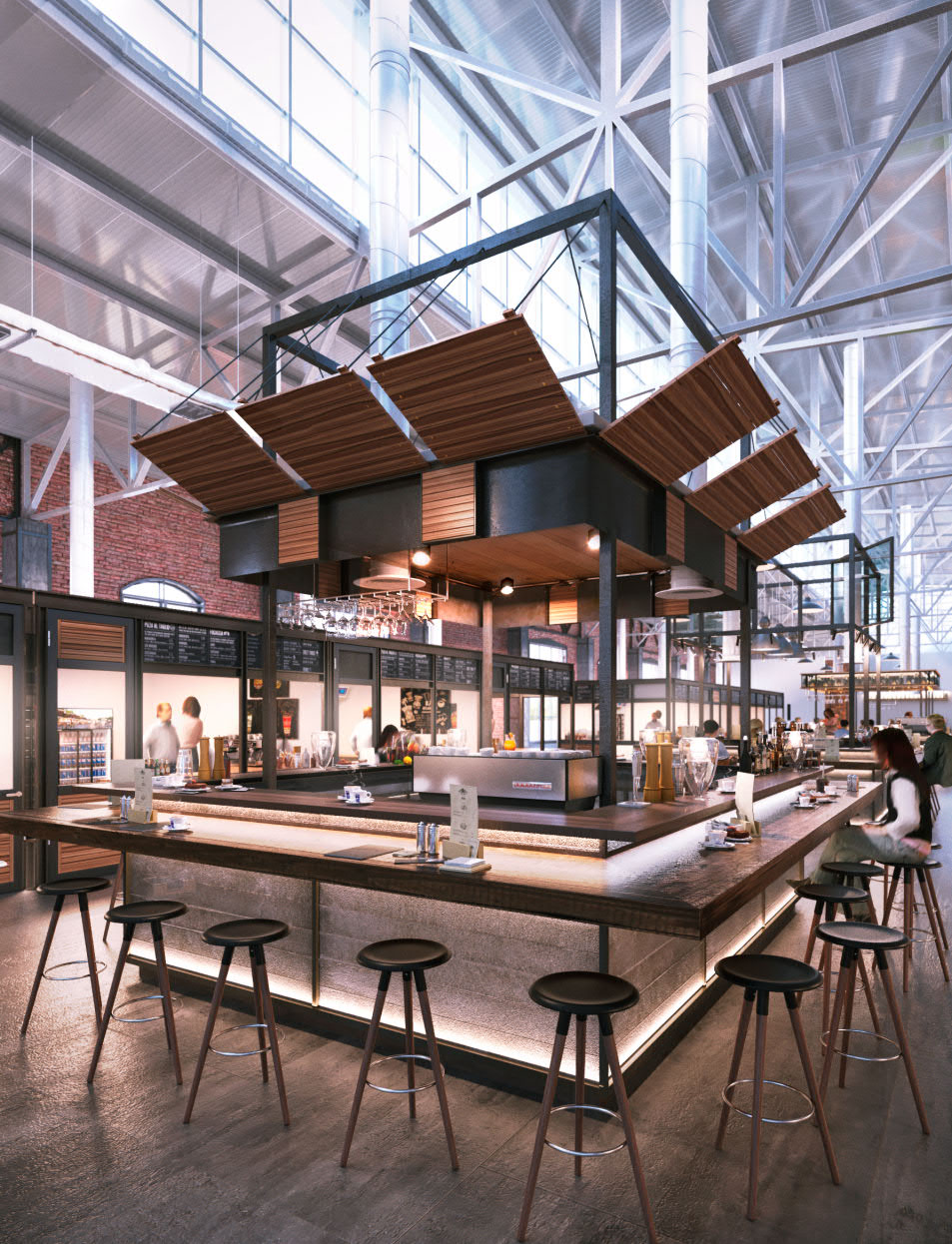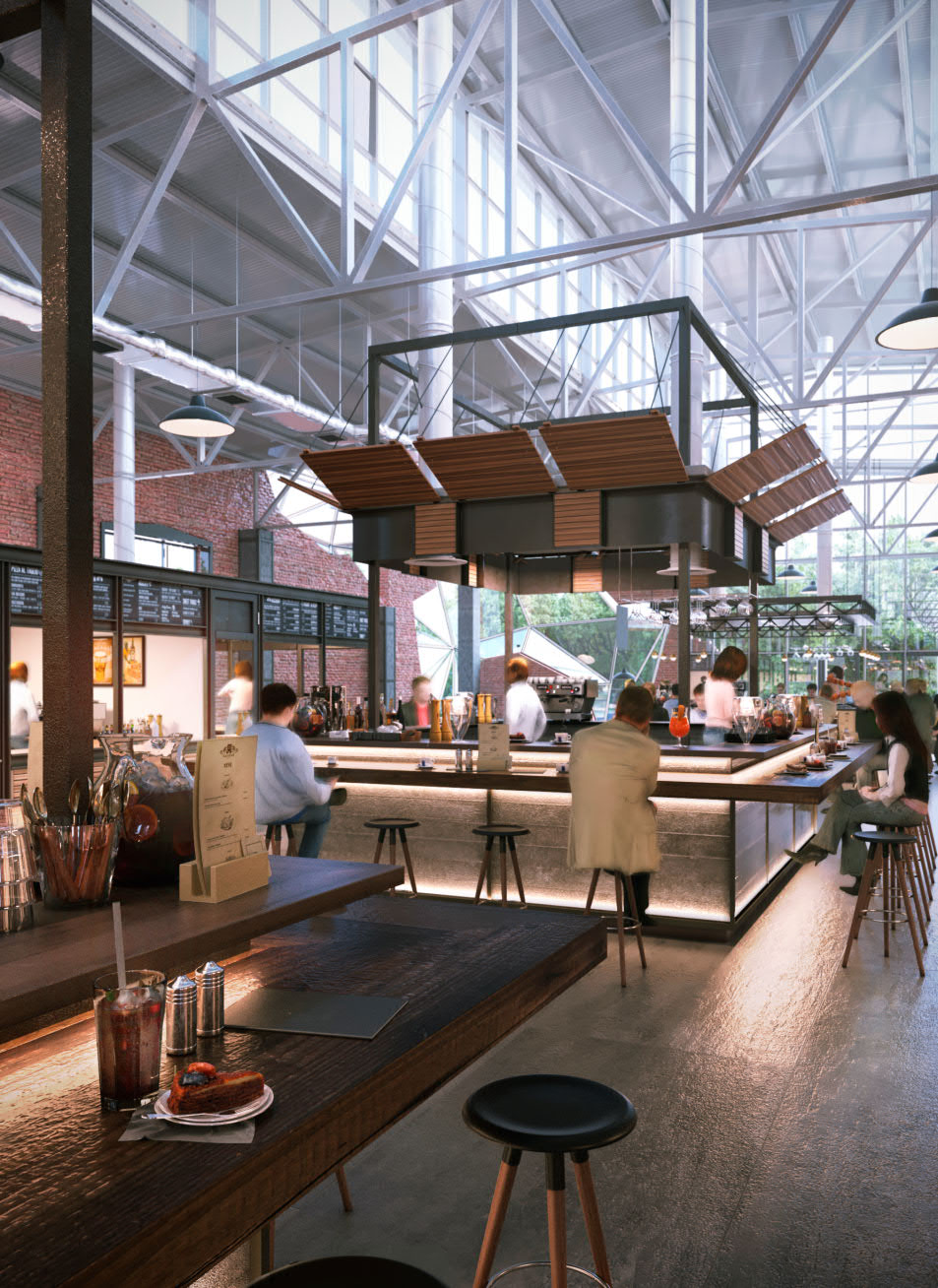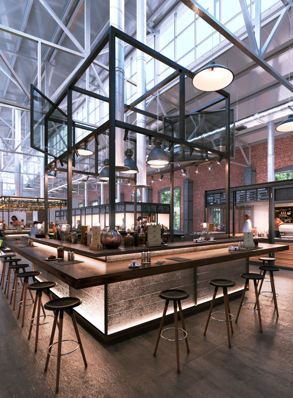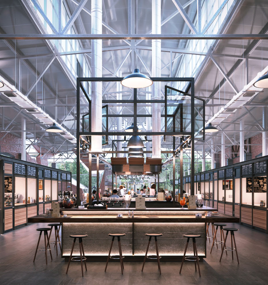У центрі внутрішньої площі розташовується стара виробнича труба, однак після конструктивного обстеження наші архітектори вирішили залишити її як домінанту, надавши їй майже скульптурного звучання. Кожен з відвідувачів може піднятися по гвинтових сходах і подивитися на те, що відбувається в Eataly в комплексі.