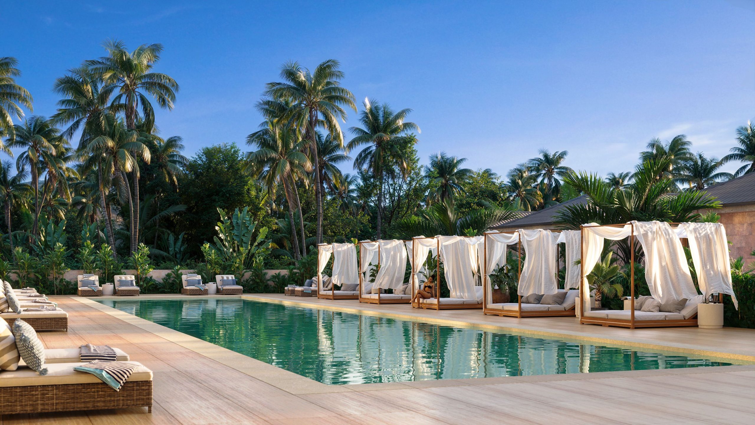 Серцем комплексу є будівля готелю, яка виступає центром тяжіння та соціальної взаємодії. В основу її концепції закладено естетику «тропічного модернізму» — стиль, який інтуїтивно зчитується як простір без кордонів. Ця проникна та легка геометрія наповнена глибокими сенсами: вона транслює відчуття свободи, світла та єднання з природою, що є критично важливим для емоційного перезавантаження.